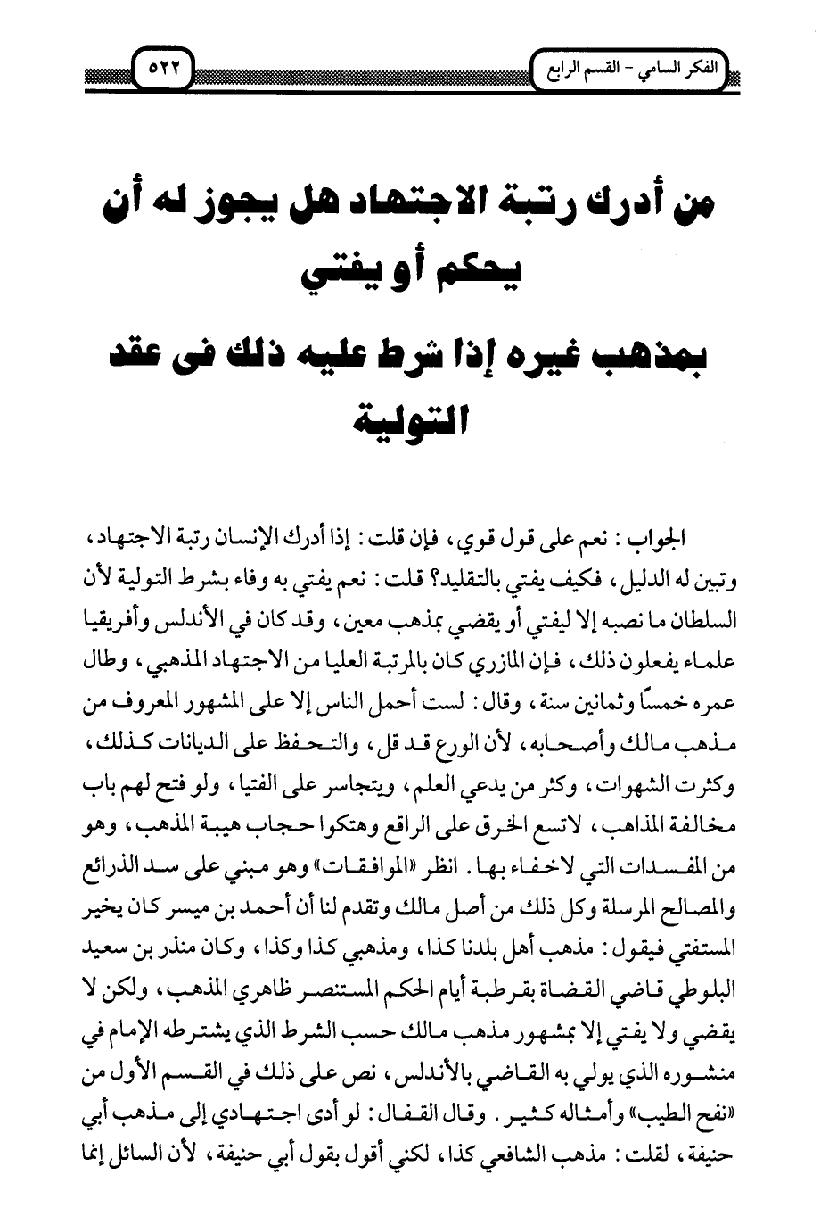 الجواب: نعم على قول قوي، فإن قلت: إذا أدرك الإنسان رتبة الاجتهاد، وتبين له الدليل، فكيف يفتي بالتقليد؟ قلت: نعم يفتي به وفاء بشرط التولية لأن السلطان ما نصه إلا ليفتي أو يقضي بمذهب معين، وقد كان في الأندلس وأفريقيا علماء يفعلون ذلك، فإن المازري كان بالمرتبة العليا من الاجتهاد المذهبي، وطال عمره خمسا وثمانين سنة، وقال: لست أحمل الناس إلا على المشهور المعروف من مذهب مالك وأصحابه؛ لأن الورع قد قل، والتحفظ على الديانات كذلك، وكثرت الشهوات، وكثر من يدعي العلم، ويتجاسر على الفتيا، ولو فتح لهم باب مخالفة المذاهب، لاتسع الخرق على الراقع وهتكوا حجاب هيبة المذهب، وهو من المفسدات التي لا خفاء بها. انظر "الموافقات" وهو مبني على سد الذرائع والمصالح المرسلة وكل ذلك من أصل مالك وتقدم لنا أن أحمد بن ميسر كان يخير المستفتي فيقول: مذهب أهل بلدنا كذا، ومذهبي كذا وكذا، ومذهبي كذا وكذا، وكان منذر بن سعيد البلوطي قاضي القضاة بقرطبة أيام الحكم المستنصر ظاهري المذهب، ولكن لا يقضي ولا يفتي إلا بمشهور مذهب مالك حسب الشرط الذي يشترطه الإمام في منشوره الذي يولي به القاضي بالأندلس، نص على ذلك في القسم الأول من "نفح الطيب" وأمثاله كثير. وقال القفال: لو أدى اجتهادي إلى مذهب أبي حنيفة، لقلت: مذهب الشافعي كذا، لكني أقول بقول أبي حنيفة؛ لأن السائل إنما