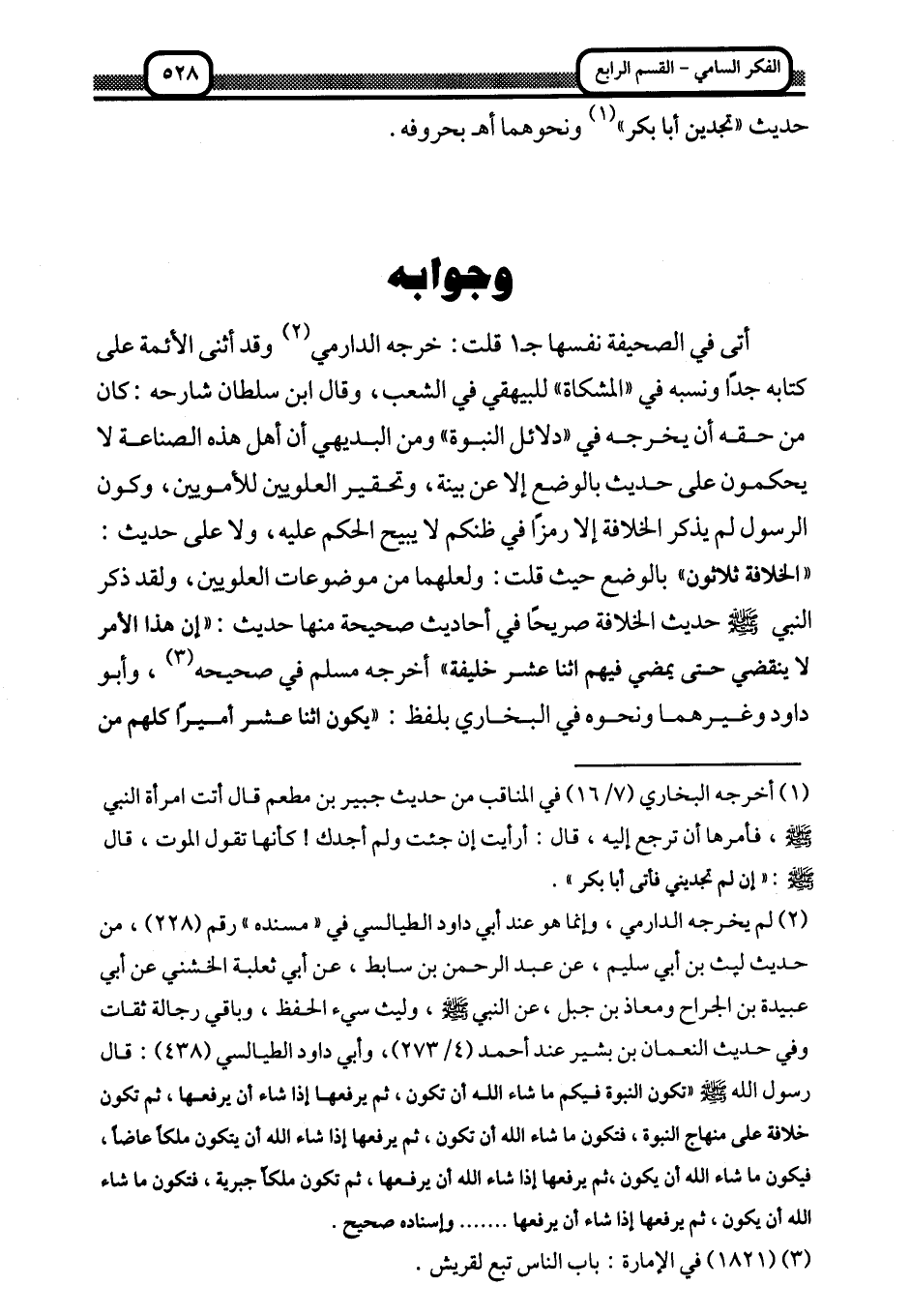 أتى في الصحيفة نفسها جـ1 قلت: خرجه الدارمي2 وقد أثنى الأئمة على كتابه جدا ونسبه في "المشكاة" للبيهقي في الشعب، وقال ابن سلطان شارحه: كان من حقه أن يخرجه في "دلائل النبوة" ومن البديهي أن أهل هذه الصناعة لا يحكمون على حديث بالوضع إلا عن بينة، وتحقير العلويين للأمويين، وكون الرسول لم يذكر الخلافة إلا رمزا في ظنكم لا يبيح الحكم عليه، ولا على حديث: "الخلافة ثلاثون" بالوضع حيث قلت: ولعلهما من موضوعات العلويين، ولقد ذكر النبي صلى الله عليه وسلم حديث الخلافة صريحا في أحاديث صحيحة منها حديث: "إن هذا الأمر لا ينقضي حتى يمضي فيهم اثنا عشر خليفة" أخرجه مسلم في صحيحه3، وأبو داود وغيرهما ونحوه في البخاري بلفظ: "يكون اثنا عشرا أميرا كلهم من