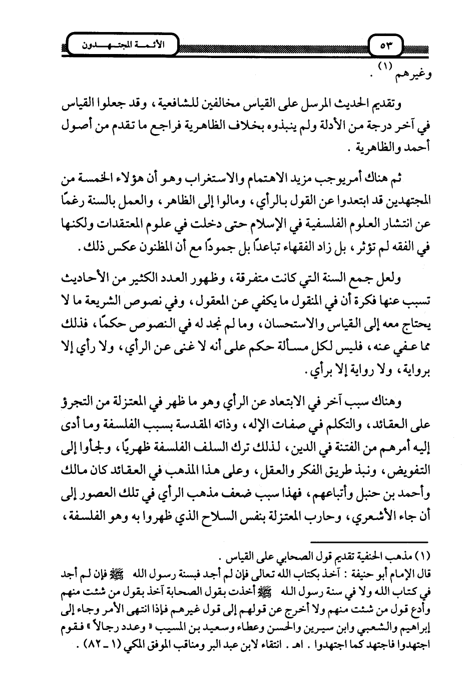 ولعل جمع السنة التي كانت متفرقة، وظهور العدد الكثير من الأحاديث تسبب عنها فكرة أن في المنقول ما يكفي عن المعقول، وفي نصوص الشريعة ما لا يحتاج معه إلى القياس والاستحسان، وما لم نجد له في النصوص حكما، فذلك مما عفي عنه، فليس لكل مسألة حكم على أنه لا غنى عن الرأي، ولا رأي إلا برواية، ولا رواية إلا برأي.
