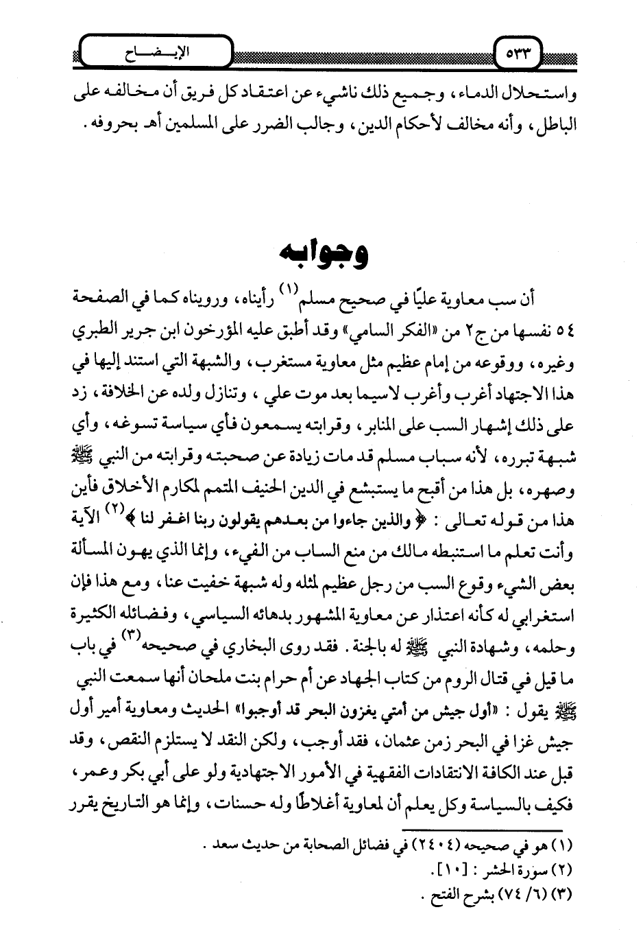 إن سب معاوية عليا في صحيح مسلم1 رأيناه، ورويناه كما في الصفحة 54 نفسها من ج2 من "الفكر السامي" وقد أطبق عليه المؤرخون ابن جرير الطبري وغيره، ووقوعه من إمام عظيم مثل معاوية مستغرب، والشبهة التي استند إليها في هذا الاجتهاد أغرب وأغرب لا سيما بعد موت علي، وتنازل ولده عن الخلافة، زد على ذلك إشهار السب على المنابر، وقرابته يسمعون فأي سياسة تسوغه، وأي شبهة تبرره؛ لأنه سباب مسلم قد مات زيادة عن صحبته وقرابته من النبي صلى الله عليه وسلم وصهره، بل هذا من أقبح ما يستبشع في الدين الحنيفة المتمم لمكارم الأخلاق فأين هذا من قوله تعالى: {وَالَّذِينَ جَاءُوا مِنْ بَعْدِهِمْ يَقُولُونَ رَبَّنَا اغْفِرْ لَنَا} 2 الآية وأنت تعلم ما استنبطه مالك من منع الساب من الفيء، وإنما الذي يهون المسألة بعض الشيء وقوع السب من رجل عظيم لمثله وله شبهة خفيت عنا، ومع هذا فإن استغرابي له كأنه اعتذار عن معاوية المشهور بدهائه السياسي، وفضائله الكثيرة وحلمه، وشهادة النبي صلى الله عليه وسلم له بالجنة. فقد روى البخاري في صحيحه3 في باب ما قيل في قتال الروم من كتاب الجهاد عن أم حرام بنت ملحان أنها سمعت النبي صلى الله عليه وسلم يقول: "أول جيش من أمتي يغزون البحر قد أوجبوا" الحديث ومعاوية أمير أول جيش غزا في البحر زمن عثمان، فقد أوجب، ولكن النقد لا يستلزم النقص، وقد قبل عند الكافة الانتقادات الفقهية في الأمور الاجتهادية ولو على أبي بكر وعمر، فكيف بالسياسة وكل يعلن أن لمعاوية أغلاط وله حسنات، وإنما هو التاريخ يقرر على وجهه، ولا أرى في تقرير المعلوم المحقق محذورا.