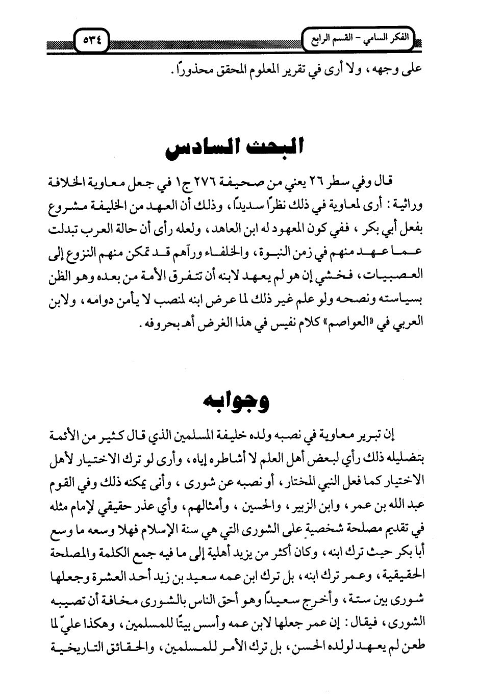 قال وفي سطر 26 يعني من صحيفة 276 ج1 في جعل معاوية الخلافة وراثية: أرى لمعاوية في ذلك نظرا سديدا، وذلك أن العهد من الخليفة مشروع بفعل أبي بكر، ففي كون المعهود له ابن العاهد، ولعله رأى أن حالة العرب تبدلت عما عهد منهم في زمن النبوة، والخلفاء وراءهم قد تمكن منهم النزوع إلى العصبيات، فخشي إن هو لم يعهد لابنه أن تتفرق الأمة من بعده وهو الظن بسياسته ونصحه ولو علم غير ذلك لما عرض ابنه لمنصب لا يأمن دوامه، ولابن العربي في "العواصم" كلام نفيس في هذا الغرض. ا. هـ. بحروفه.