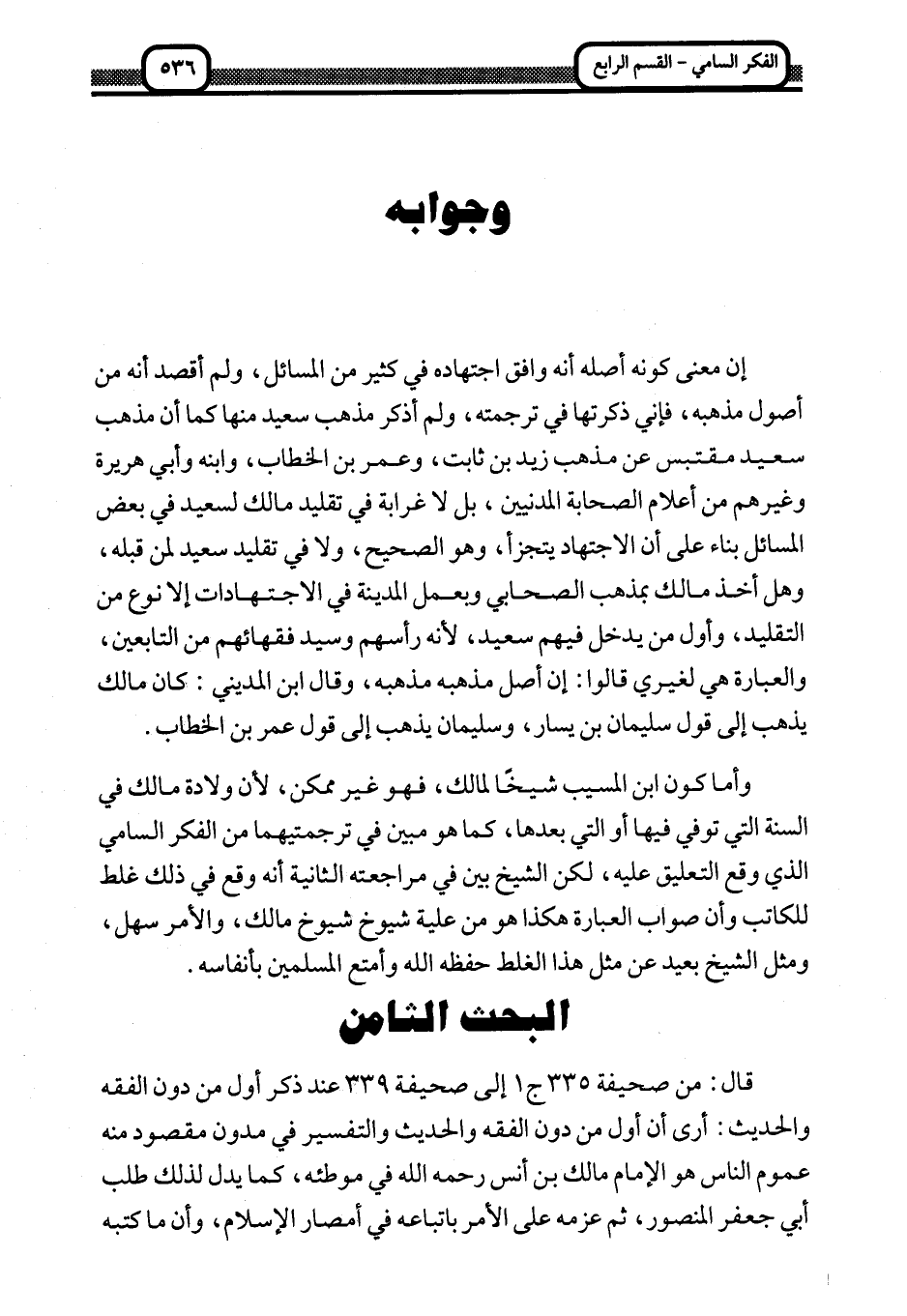 وأما كون ابن المسيب شيخا لمالك، فهو غير ممكن؛ لأن ولاده مالك في السنة التي توفي فيها أو التي بعدها، كما هو مبين في ترجمتيهما من الفكر السامي الذي وقع التعليق عليه، لكن الشيخ بين في مراجعته الثانية أنه وقع في ذلك غلط للكاتب وأن صواب العبارة هكذا هو من علية شيوخ شيوخ مالك، والأمر سهل، ومثل الشيخ بعيد عن مثل هذا الغلط حفظه الله وأمتع المسلمين بأنفاسه.
