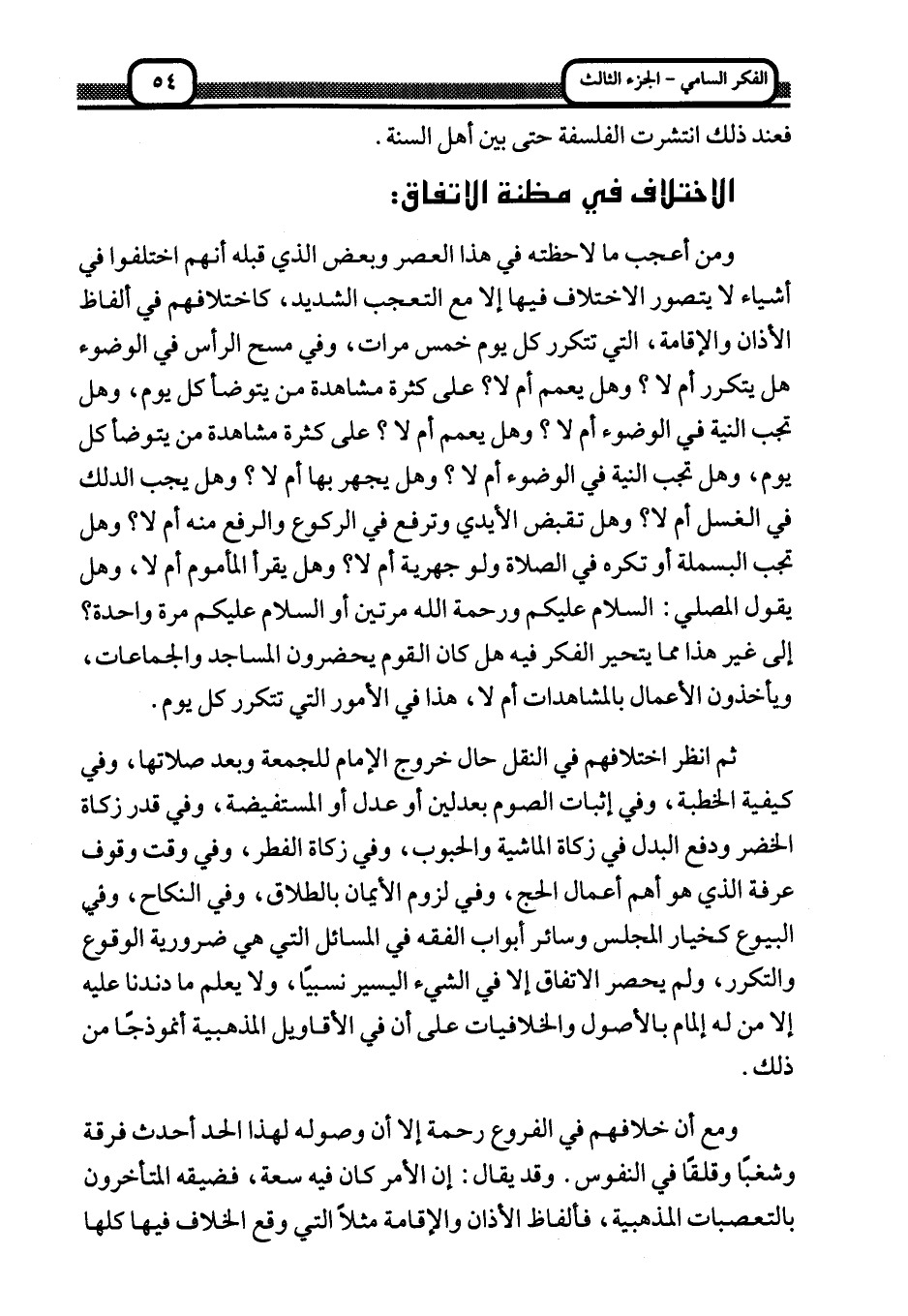 ومن أعجب ما لاحظته في هذا العصر وبعض الذي قبله أنهم اختلفوا في أشياء لا يتصور الاختلاف فيها إلا مع التعجب الشديد، كاختلافهم في ألفاظ الأذان والإقامة، التي تتكرر كل يوم خمس مرات، وفي مسح الرأس في الوضوء هل يتكرر أم لا؟ وهل يعمم أم لا؟ على كثرة مشاهدة من يتوضأ كل يوم، وهل تجب النية في الوضوء أم لا؟ وهل يعمم أم لا؟ على كثرة مشاهدة من يتوضأ كل يوم، وهل تجب النية في الوضوء أم لا؟ وهل يجهر بها أم لا؟ وهل يجب الدلك في الغسل أم لا؟ وهل تقبض الأيدي وترفع في الركوع والرفع منه أم لا؟ وهل تجب البسملة أو تكره في الصلاة ولو جهرية أم لا؟ وهل يقرأ المأموم أم لا، وهل يقول المصلي: السلام عليكم ورحمة الله مرتين أو السلام عليكم مرة واحدة؟ إلى غير هذا مما يتحير الفكر فيه هل كان القوم يحضرون المساجد والجماعات، ويأخذون الأعمال بالمشاهدات أم لا، هذا في الأمور التي تتكرر كل يوم.