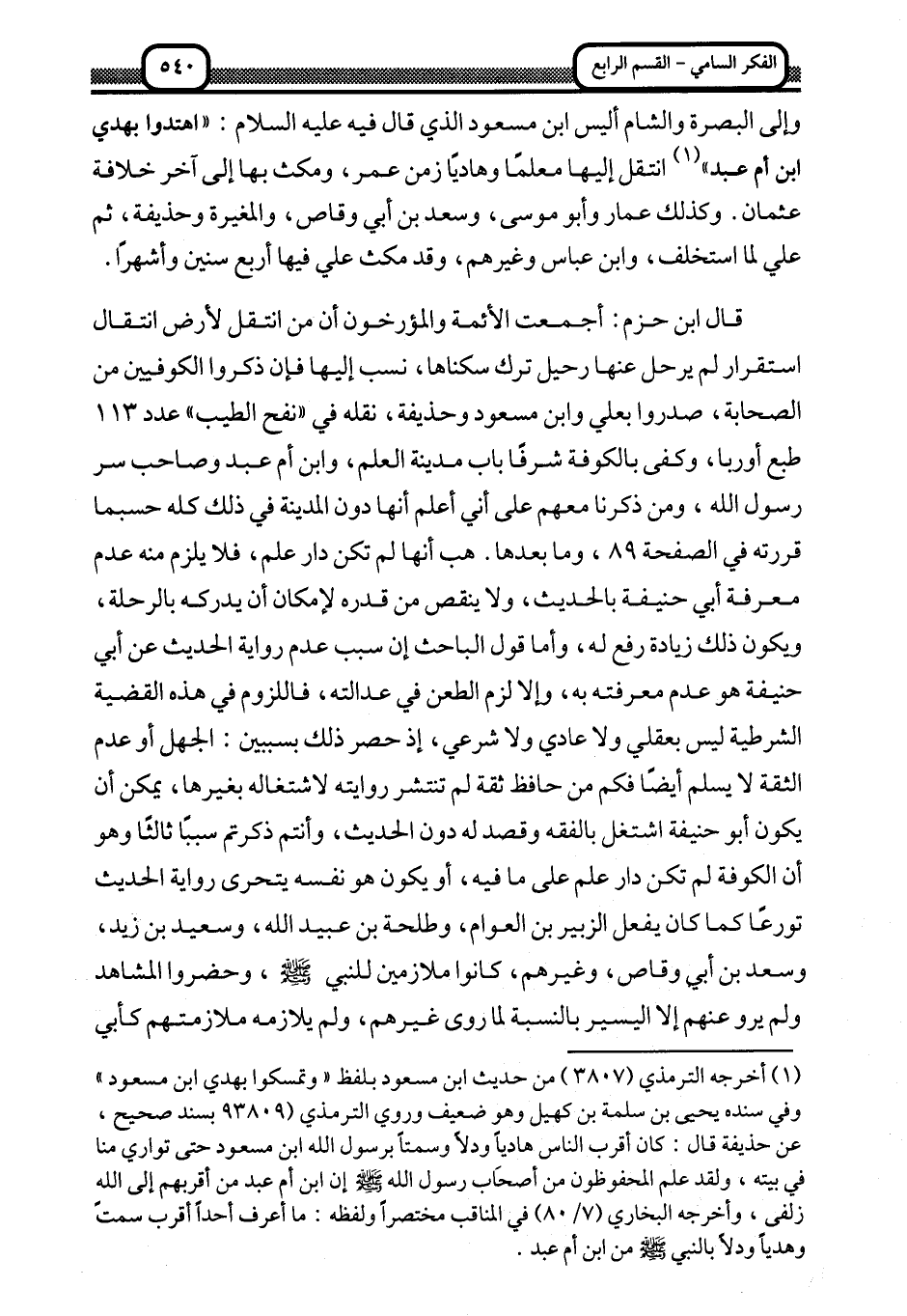 قال ابن حزم: أجمعت الأئمة والمؤرخون أن من انتقل لأرض انتقال استقرار لم يرحل عنها رحيل ترك سكناها، نسب إليها فإن ذكروا الكوفيين من الصحابة، صدروا بعلي وابن مسعود وحذيفة، نقله في "نفح الطيب" عدد 113 طبع أوروبا، وكفى بالكوفة شرفا باب مدينة العلم، وابن أم عبد وصاحب سر رسول الله، ومن ذكرنا معهم على أني أعلم أنها دون المدينة في ذلك كله حسبما قررته في الصفحة 89، وما بعدها. هب أنها لم تكن دار علم، فلا يلزم منه عدم معرفة أبي حنيفة بالحديث، ولا ينقص من قدره لإمكان أن يدركه بالرحلة، ويكون ذلك زيادة رفع، له وأما قول الباحث إن سبب عدم رواية الحديث عن أبي حنيفة هو عدم معرفته به، وإلا لزم الطعن في عدالته، فاللزوم في هذه القضية الشرطية ليس بعقلي ولا عادي ولا شرعي؛ إذ حصر ذلك بسببين: الجهل أو عدم الثقة لا يسلم أيضا فكم من حافظ ثقة لم تنتشر روايته لاشتغاله بغيرها، يمكن أن يكون أبو حنيفة اشتغل بالفقه وقصد له دون الحديث، وأنتم ذكرتم سببا ثالثا وهو أن الكوفة لم تكن دار علم على ما فيه، أو يكون هو نفسه يتحرى رواية الحديث تورعا كما كان يفعل الزبير بن العوام، وطلحة بن عبيد الله، وسعيد بن زيد، وسعد بن أبي وقاص، وغيرهم، كانوا ملازمين للنبي صلى الله عليه وسلم، وحضروا المشاهد ولم يرو عنهم إلا اليسير بالنسبة لما روى غيرهم، ولم يلازمه ملازمتهم كأبي