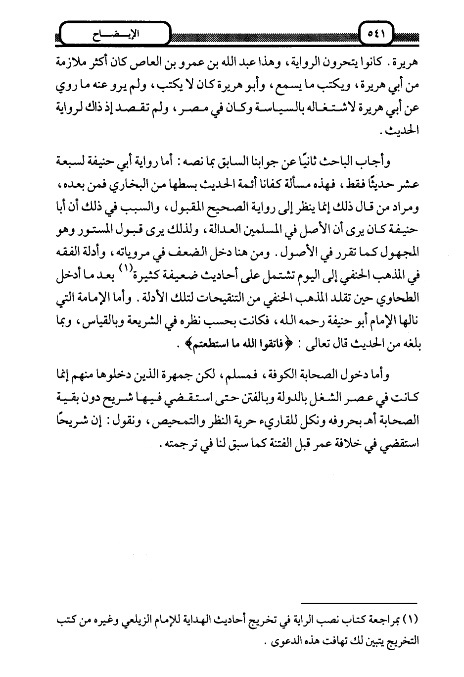 وأجاب الباحث ثانيا عن جوابنا السابق بما نصه: أما رواية أبي حنيفة لسبعة عشر حديثا فقط، فهذه مسألة كفانا أئمة الحديث بسطها من البخاري فمن بعده، ومراد من قال ذلك إنما ينظر إلى رواية الصحيح المقبول، والسبب في ذلك أن أبا حنيفة كان يرى أن الأصل في المسلمين العدالة، ولذلك يرى قبول المستور وهو المجهول كما تقرر في الأصول. ومن هنا دخل الضعف في مروياته، وأدلة الفقه في المذهب الحنفي إلى اليوم تشتمل على أحاديث ضعيفة كثيرة1 بعدما أدخل الطحاوي حين تقلد المذهب الحنفي من التنقيحات لتلك الأدلة. وأما الإمامة التي نالها الإمام أبو حنيفة رحمه الله، فكانت بحسب نظره في الشريعة وبالقياس، وبما بلغه من الحديث قال تعالى: {فَاتَّقُوا اللَّهَ مَا اسْتَطَعْتُمْ} .