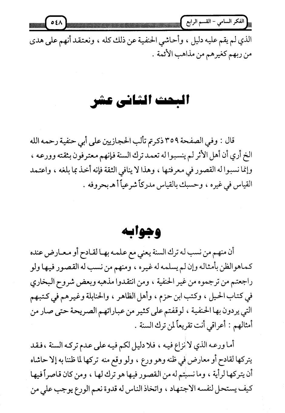 قال: وفي الصفحة 359 ذكرتم تألب الحجازيين على أبي حنيفة رحمه الله إلخ أرى أن أهل الأثر لم ينسبوا له تعمد ترك السنة فإنهم معترفون بثقته وورعه، وإنما نسبوا له القصور في معرفتها، وهذا لا ينافي الثقة فإنه أخذ بما بلغه، واعتمد القياس في غيره، وحسبك بالقياس مدركا شرعيا. ا. هـ. بحروفه.