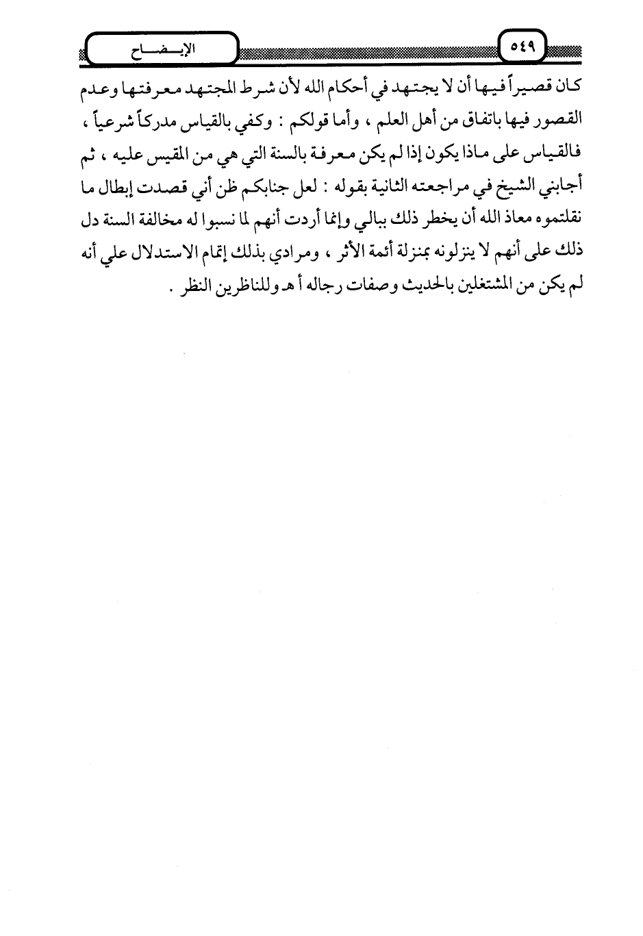 كان قصيرا فيها أن لا يجتهد في أحكام الله لأن شرط المجتهد معرفتها وعدم القصور فيها باتفاق من أهل العلم، وأما قولكم: وكفى بالقياس مدركا شرعيا، فالقياس على ماذا يكون إذا لم يكن معرفة بالسنة التي هي من المقيس عليه، ثم أجابني الشيخ في مراجعته الثانية بقوله: لعل جنابكم ظن أني قصدت إبطال ما نقلتموه معاذ الله أن يخطر ذلك ببالي وإنما أردت أنهم لما نسبوا له مخالفة السنة دل ذلك على أنهم لا ينزلونه بمنزلة أئمة الأثر، ومرادي بذلك إتمام الاستدلال على أنه لم يكن من المشتغلين بالحديث وصفات رجاله. ا. هـ. وللناظرين النظر.