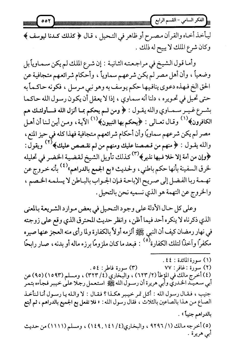 وأما قول الشيخ في مراجعته الثانية: إن شرع الملك لم يكن سماويا بل وضعيا، وأن أهل مصر لم يكن شرعهم سماويا، وأحكام شرائعهم متجافية عن الحق إلخ فهذه دعوى ينافيها حكم يوسف به وهو نبي مرسل، فكونه حاكما به حتى تحيل في تحويره، دلنا أنه سماوي، إذ لا يعقل أن يكون رسول الله حاكما بشرع غير سماوي والله يقول: {وَمَنْ لَمْ يَحْكُمْ بِمَا أَنْزَلَ اللَّهُ فَأُولَئِكَ هُمُ الْكَافِرُونَ} 1 وقال تعالى: {يَحْكُمُ بِهَا النَّبِيُّونَ} 1 الآية، ومن أين لنا أن أهل مصر لم يكن شرعهم سماويا وأن أحكم شرائعهم متجافية فهذا كله في حيز المنع، والله يقول: {مِنْهُمْ مَنْ قَصَصْنَا عَلَيْكَ وَمِنْهُمْ مَنْ لَمْ نَقْصُصْ عَلَيْكَ} 2 ويقول: {وَإِنْ مِنْ أُمَّةٍ إِلَّا خَلَا فِيهَا نَذِيرٌ} 3 كذلك تأويل الشيخ لقضية الخضر في تحليله لخرق السفينة بأنها حكم باطني، ولحديث "بع الجمع بالدراهم" 4 بأنه خروج عن تهمة ربا الفضل إلى صريح الإباحة فإن الجواب بالباطن لا يسلمه الخصم، والخروج عن التهمة هو الذي نسميه نحن بالتحيل.