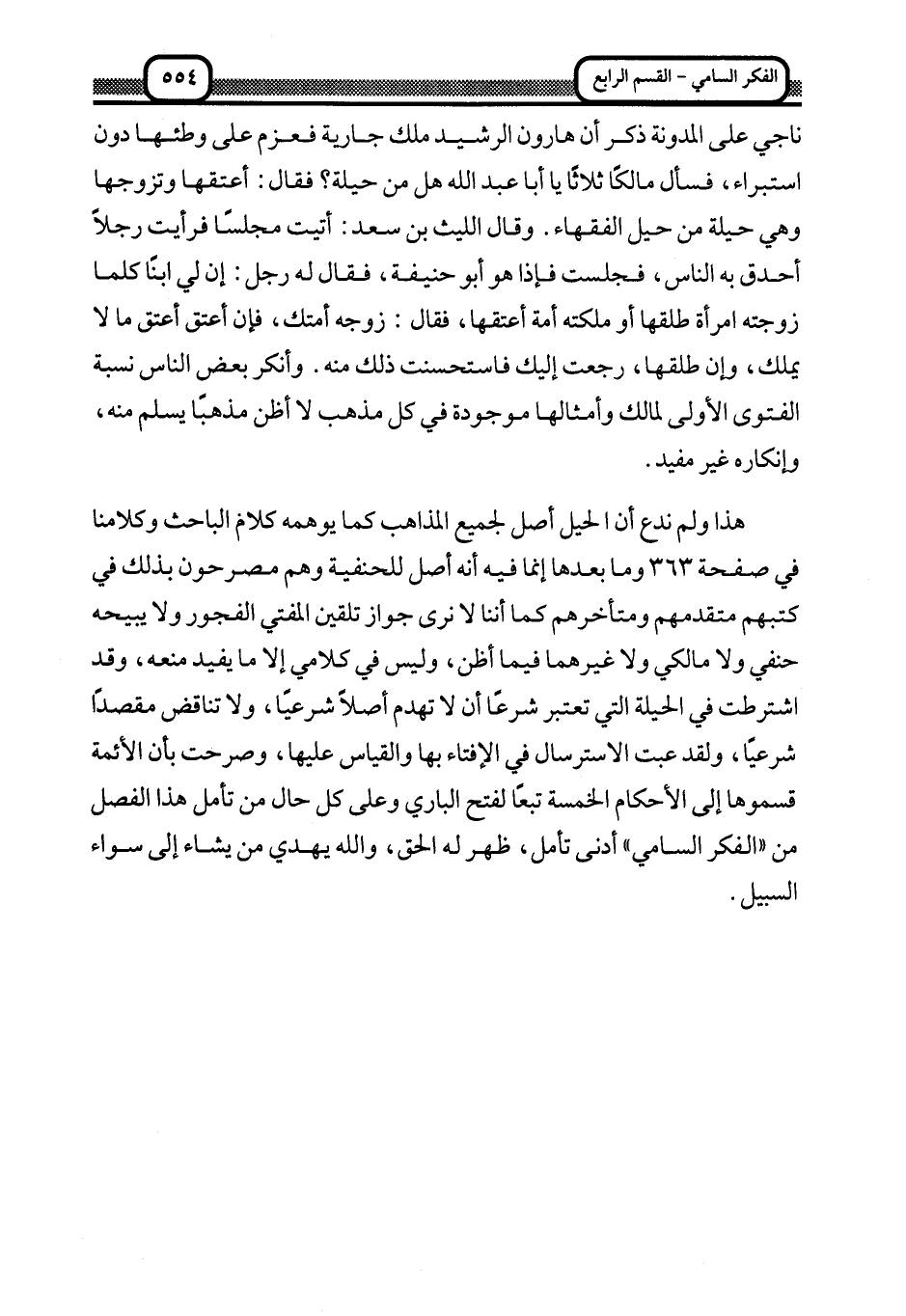 هذا ولم ندع أن الحيل أصل لجميع المذاهب كما يوهمه كلام الباحث وكلامنا في صفحة 363 وما بعدها إنما فيه أنه أصل للحنفية وهم مصرحون بذلك كتبهم متقدمهم ومتأخرهم كما أننا لا نرى جواز تلقين المفتي الفجور ولا يبيحه حنفي ولا مالكي ولا غيرهما فيما أظن، وليس في كلامي إلا ما يفيد منعه، وقد اشترطت في الحيلة التي تعتبر شرعا أن لا تهدم أصلا شرعيا، ولا تناقض مقصدا شرعيا، ولقد عبت الاسترسال في الإفتاء بها والقياس عليها، وصرحت بأن الأئمة قسموها إلى الأحكام الخمسة تبعا لفتح الباري وعلى كل حال من تأمل هذا الفصل من "الفكر السامي" أدنى تأمل، ظهر له الحق، والله يهدي من يشاء إلى سواء السبيل.