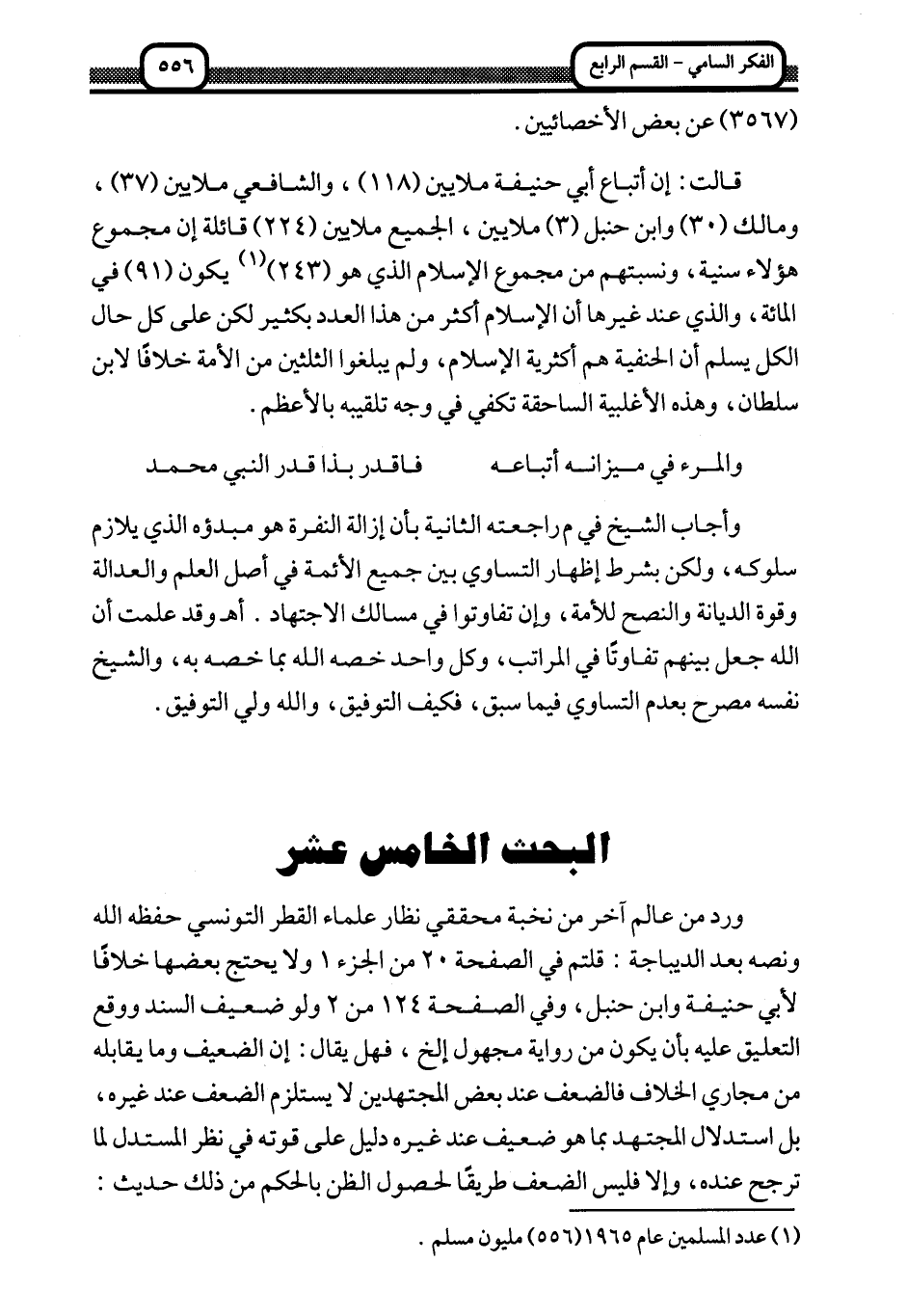 قالت: إن أتباع أبي حنيفة ملايين "118"، والشافعي ملايين "37"، ومالك "30" وابن حنبل "3" ملايين، الجميع ملايين "224" قائلة إن مجموع هؤلاء سنية، ونسبتهم من مجموع الإسلام الذي هو "243"1 يكون "91" في المائة، والذي عند غيرها أن الإسلام أكثر من هذا العدد بكثير لكن على كل حال الكل يسلم أن الحنفية هم أكثرية الإسلام، ولم يبلغوا الثلثين من الأمة خلافا لابن سلطان، وهذه الأغلبية الساحقة تكفي في وجه تلقيبه بالأعظم.