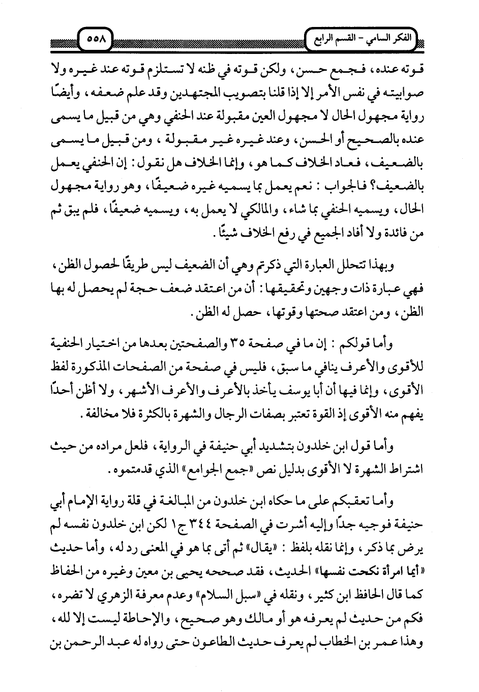 قوته عنده، فجمع حسن، ولكن قوته في ظنه لا تستلزم قوته عند غيره ولا صوابيته في نفس الأمر إلا إذا قلنا بتصويب المجتهدين وقد علم ضعفه، وأيضا رواية مجهول الحال لا مجهول العين مقبولة عند الحنفي وهي من قبيل ما يسمى عنده بالصحيح أو الحسن، وعند غيره غير مقبولة، ومن قبيل ما يسمى بالضعيف، فعاد الخلاف كما هو، وإنما الخلاف هل نقول: إن الحنفي يعمل بالضعيف؟ فالجواب: نعم يعمل بما يسميه غيره ضعيفا، وهو رواية مجهول الحال، ويسميه الحنفي بما شاء، والمالكي لا يعمل به، ويسميه ضعيفا، فلم يبق ثم من فائدة ولا أفاد الجميع في رفع الخلاف شيئا.