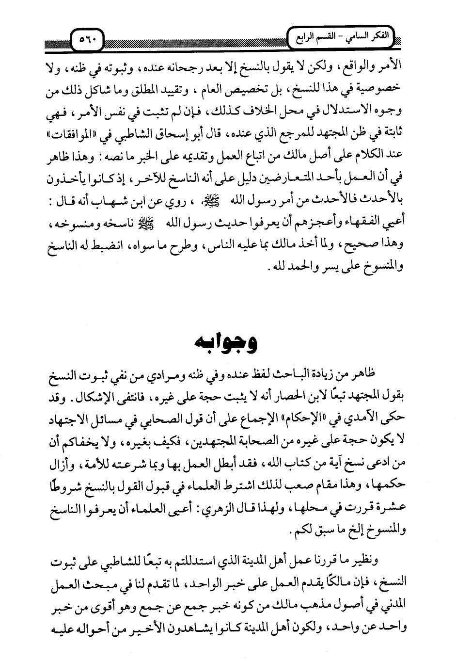 الأمر والواقع، ولكن لا يقول بالنسخ إلا بعد رجحانه عنده، وثبوته في ظنه، ولا خصوصية في هذا للنسخ، بل تخصيص العام، وتقييد المطلق وما شاكل ذلك من وجوه الاستدلال في محل الخلاف كذلك، فإن لم تثبت في نفس الأمر، فهي ثابتة في ظن المجتهد للمرجع الذي عنده، قال أبو إسحاق الشاطبي في "الموافقات عند الكلام على أصل مالك من اتباع العمل وتقديمه على الخبر ما نصه: وهذا ظاهر في أن العمل بأحد المتعارضين دليل على أنه الناسخ للآخر؛ إذ كانوا يأخذون بالأحدث وأعجزهم أن يعرفوا حديث رسول الله صلى الله عليه وسلم، روي عن ابن شهاب أنه قال: أعيي الفقهاء وأعجزهم أن يعرفوا حديث رسول الله صلى الله عليه وسلم ناسخه ومنسوخه، وهذا صحيح، ولما أخذ مالك بما عليه الناس، وطرح ما سواه، انضبط له الناسخ والمنسوخ على يسر والحمد لله.