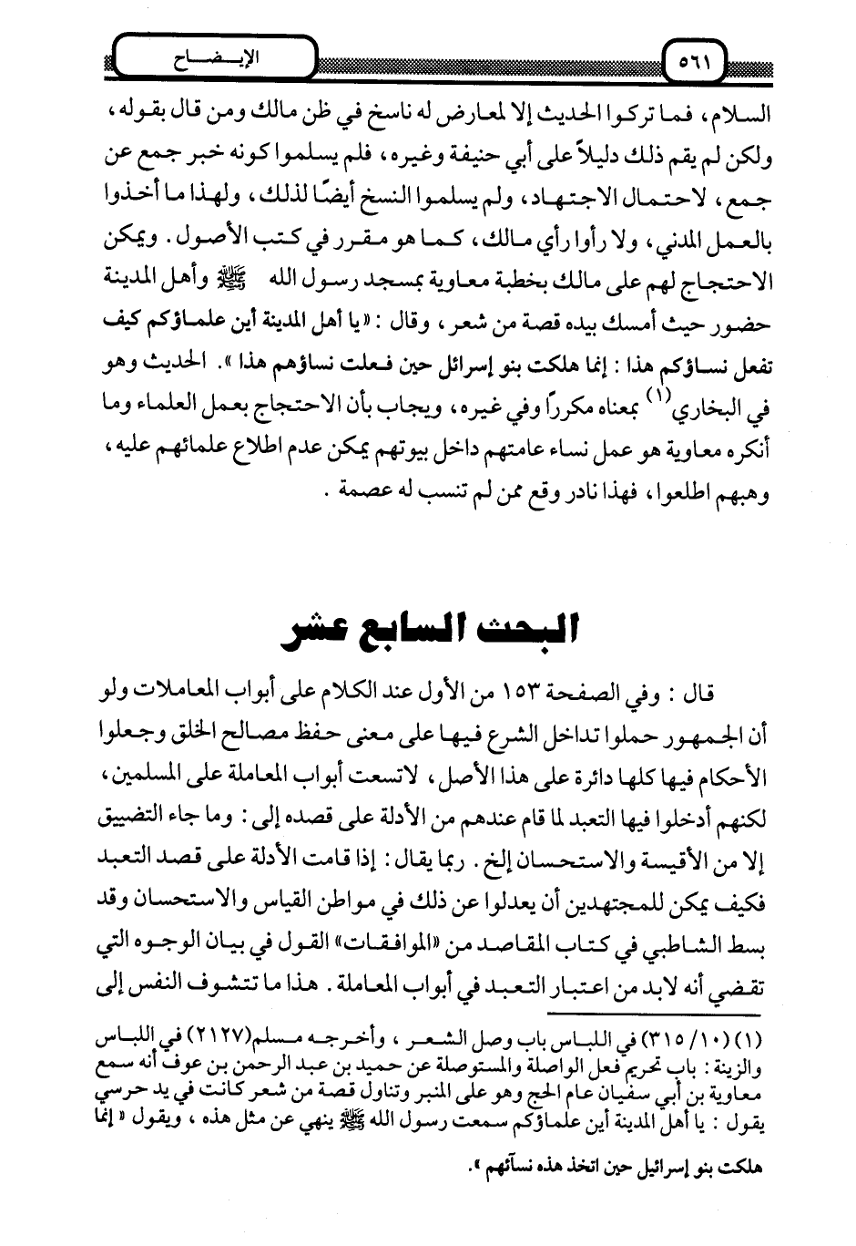 السلام، فما تركوا الحديث إلا لمعارض له ناسخ في ظن مالك ومن قال بقوله، ولكن لم يقم ذلك دليلا على أبي حنيفة وغيره، فلم يسلموا كونه خبر جمع عن جمع، لاحتمال الاجتهاد، ولم يسلموا النسخ أيضا لذلك، ولهذا ما أخذوا بالعمل المدني، ولا رأوا رأي مالك، كما هو مقرر في كتب الأصول. ويمكن الاحتجاج لهم على مالك بخطبة معاوية بمسجد رسول الله صلى الله عليه وسلم وأهل المدينة حضور حيث أمسك بيده قصة من شعر، وقال: "يا أهل المدينة أين علماؤكم كيف تفعل نساؤكم هذا: إنما هلكت بنو إسرائيل حين فعلت نساؤهم هذا". الحديث وهو في البخاري1 بمعناه مكررا وفي غيره، ويجاب بأن الاحتجاج بعمل العلماء وما أنكره معاوية هو عمل نساء عامتهم داخل بيوتهم يمكن عدم اطلاع علمائهم عليه، وهبهم اطلعوا، فهذا نادر وقع ممن لم تنسب له عصمة.