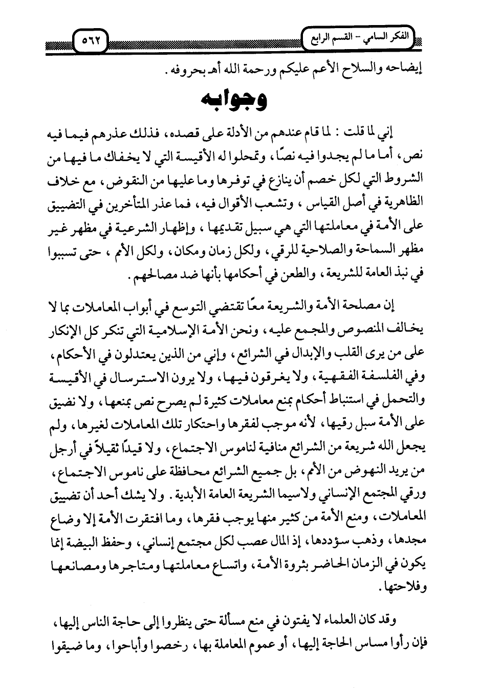 إن مصلحة الأمة والشريعة معا تقتضي التوسع في أبواب المعاملات بما لا يخالف المنصوص والمجمع عليه، ونحن الأمة الإسلامية التي تنكر كل الإنكار على من يرى القلب والإبدال في الشرائع، وإني من الذين يعتدلون في الأحكام، وفي الفلسفة الفقهية، ولا يغرقون فيها، ولا يرون الاسترسال في الأقيسة والتحمل في استنباط أحكام بمنع معاملات كثيرة لم يصرح نص بمنعها، ولا نضيق على الأمة سبل رقيها؛ لأنه موجب لفقرها واحتكار تلك المعاملات لغيرها، ولم يجعل الله شريعة من الشرائع منافية لناموس الاجتماع، ولا قيدا ثقيلا في أرجل من يريد النهوض من الأمم، بل جميع الشرائع محافظة على ناموس الاجتماع، ورقي المجتمع الإنساني ولا سيما الشريعة العامة الأبدية. ولا يشك أحد أن تضييق المعاملات، ومنع الأمة من كثير منها يوجب فقرها، وما افتقرت الأمة إلا وضاع مجدها، وذهب سؤددها؛ إذ المال عصب لكل مجتمع إنساني، وحفظ البيضة إنما يكون في الزمان الحاضر بثروة الأمة، واتساع معاملتها ومتاجرها ومصانعها وفلاحتها.