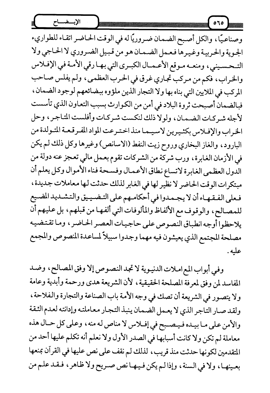 وصناعيا، والكل أصبح الضمان ضروريا له في الوقت الحاضر اتقاء للطوارئ الجوية والحربية وغيرها فعمل الضمان هو من قبيل الضروري لا الحاجي ولا التحسيني، ومنعه موقع الأعمال الكبرى التي بها رقي الأمة في الإفلاس والخراب، فكم من مركب تجاري غرق في الحرب العظمى، ولم يفلس صاحب المركب في الملايين التي بناه بها ولا التجار الذين ملئوه ببضائعهم لوجود الضمان، فبالضمان أصبحت ثروة البلاد في أمن من الكوارث بسبب التعاون الذي تأسست لأجله شركات الضمان، ولولا ذلك لنكست شركات وأفلست المتاجر، وحل الخراب والإفلاس بكثيرين لا سيما منذ اخترعت المواد المفرقعة المتولدة من البارود، والغاز البخاري وروح زيت النفط "الأسانص" وغيرها وكل ذلك لم يكن في الأزمان الغابرة، ورب شركة من الشركات تقوم بعمل مالي تعجز عنه دولة من الدول العظمى الغابرة لاتساع نطاق الأعمال وفسحة فناء الأموال وكل يعلم أن مبتكرات الوقت الحاضر لا نظير لها في الغابر لذلك حدثت لها معاملات جديدة، فعلى الفقهاء أن لا يجمدوا في أحكامهم على التضييق والتشديد المضيع للمصالح، والوقوف مع الألفاظ والمألوفات التي ألفها من قبلهم، بل عليهم أن يلاحظوا أوجه انطباق النصوص على حاجيات العصر الحاضر، وما تقتضيه مصلحة المجتمع الذي يعيشون فيه مهما وجدوا سبيلا لمساعدة المنصوص والمجمع عليه.