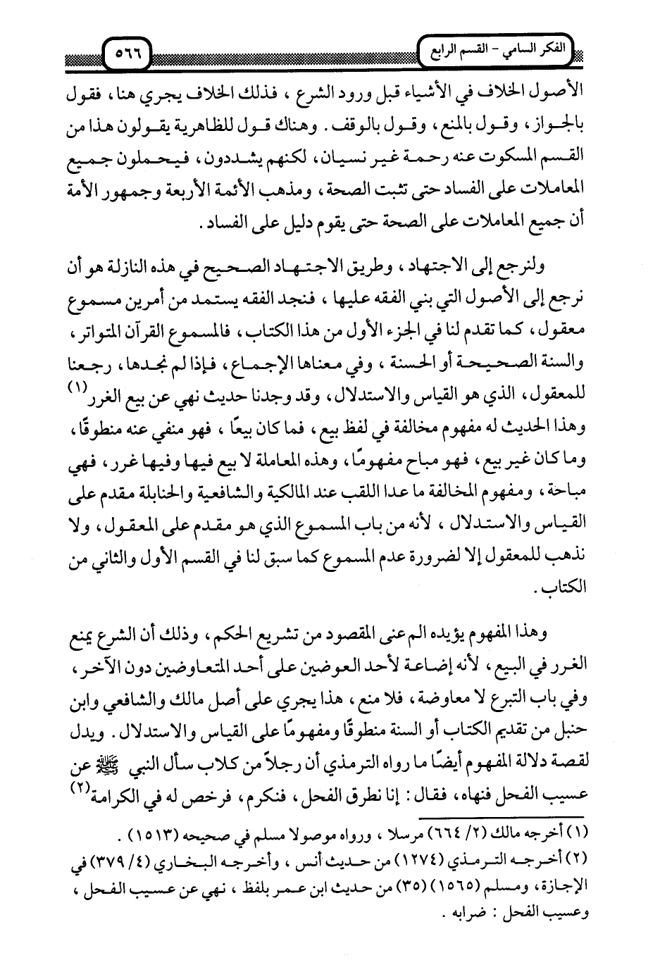 ولنرجع إلى الاجتهاد، وطريق الاجتهاد الصحيح في هذه النازلة هو أن نرجع إلى الأصول التي بني الفقه عليها، فنجد الفقه يستمد من أمرين مسموع معقول، كما تقدم لنا في الجزء الأول من هذا الكتاب، فالمسموع القرآن المتواتر، والسنة الصحيحة أو الحسن، وفي معناها الإجماع، فإذا لم نجدها، رجعنا للمعقول، الذي هو القياس والاستدلال، وقد وجدنا حديث نهى عن بيع الغرر1 وهذا الحديث له مفهوم مخالفة في لفظ بيع، فما كان بيعا، فهو منفي عنه منطوقا، وما كان غير بيع، فهو مباح مفهوما، وهذه المعاملة لا بيع فيها وفيها غرر، فهي مباحة، ومفهوم المخالفة ما عدا اللقب عند المالكية والشافعية والحنابلة مقدم على القياس والاستدلال؛ لأنه من باب المسموع الذي هو مقدم على المعقول، ولا نذهب للمعقول إلا لضرورة عدم المسموع كما سبق لنا في القسم الأول والثاني من الكتاب.