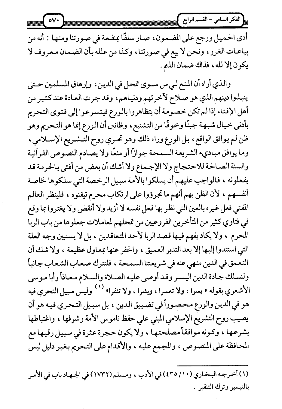 والذي أراه أن المنع ليس سوى تمحل في الدين، وإرهاق المسلمين حتى ينبذوا دينهم الذي هو صلاح لآخرتهم ودنياهم، وقد جرت العادة عند كثير من أهل الإفتاء إذا لم تكن خصومة أن يتظاهروا بالورع فيتسرعوا إلى فتوى التحريم بأدنى خيال شبهة جبنا وخوفا من التشنع، وظانين أن الورع إنما هو التحريم وهو ظن لم يوافق الواقع، بل الورع وراء ذلك وهو تحري روح التشريع الإسلامي، وما يوافق مبادئ الشريعة السمحة جوازا أو منعا ولا يصادم النصوص القرآنية والسنة الصالحة للاحتجاج ولا الإجماع ولا أشك أن بعض من أفتى بالحرمة قد يفعلونه، فالواجب عليهم أن يسلكوا بالأمة سبيل الرخصة التي سلكوها لخاصة أنفسهم؛ لأن الظن بهم أنهم ما تجرءوا على ارتكاب محرم تيقنوه، فلينظر العالم المفتي فعل غيره بالعين التي نظر بها فعل نفسه لا أزيد ولا أنقص ولا يغتروا بما وقع في فتاوى كثير من المتأخرين الفروعيين من تمحلهم لمعاملات جعلوها من باب الربا المحرم، ولا يكاد يفهم فيها قصد الربا لأحد المتعاقدين، بل لا يستبين وجه العلة التي استندوا إليها إلا بعد التدبر العميق، والحفر عنها بمعاول عظيمة، ولا شك أن التعمق في الدين منهي عنه في شريعتنا السمحة، فلنترك صعاب الشعاب جانبا ولنسلك جادة الدين اليسر وقد أوصى عليه الصلاة والسلام معاذا وأبا موسى الأشعري بقوله: "يسرا، ولا تعسرا، وبشرا، ولا تنفرا" 1 وليس سبيل التحري فيه هو في الدين والورع محصورا في تضييق الدين، بل سبيل التحري فيه هو أن يصيب روح التشريع الإسلامي المبني على حفظ ناموس الأمة وشرفها، واغتباطها بشرعها، وكونه موافقا مصلحتها، ولا يكون حجرة عثرة في سبيل رقيها مع المحافظة على المنصوص، والمجمع عليه، والأقدام على التحريم بغير دليل ليس