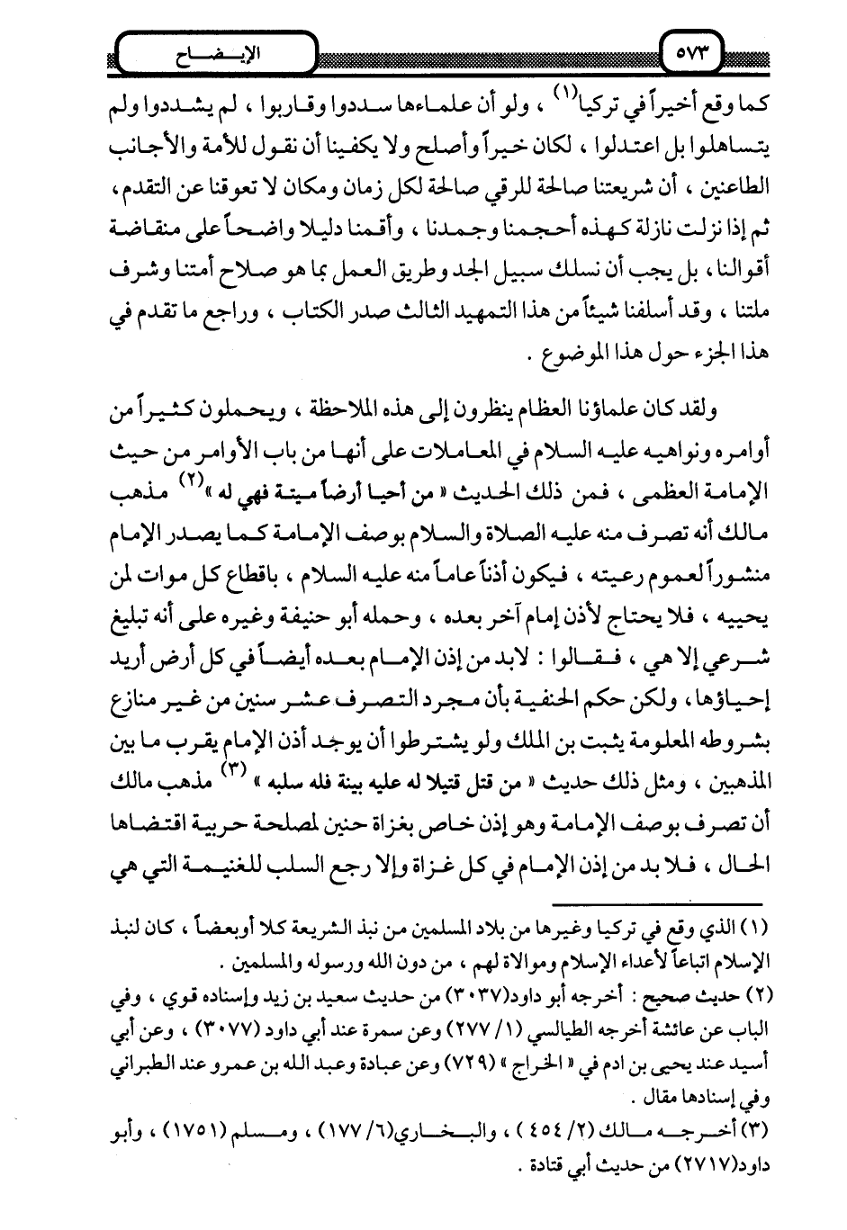 ولقد كان علماؤنا العظام ينظرون إلى هذه الملاحظة، ويحملون كثيرا من أوامره ونواهيه عليه السلام في المعاملات على أنها من باب الأوامر من حيث الإمامة العظمى، فمن ذلك الحديث: "من أحيا أرضا ميتة فهي له" 2 مذهب مالك أنه تصرف منه عليه الصلاة والسلام بوصف الإمامة كما يصدر الإمام منشورا لعموم رعيته، فيكون أذنا عاما منه عليه السلام، بإقطاع كل موات لمن يحييه، فلا يحتاج لأذن إمام آخر بعده، وحمله أبو حنيفة وغيره على أنه تبليغ شرعي إلا هي، فقالوا: لا بد من إذن الإمام بعده أيضا في كل أرض أريد إحياؤها، ولكن حكم الحنفية بأن مجرد التصرف عشر سنين من غير منازع بشروطه المعلومة يثبت به الملك ولو يشترطوا أن يوجد أذن الإمام يقرب ما بين المذهبين، ومثل ذلك حديث "من قتل قتيلا له عليه بينة فله سلبه" 3 مذهب مالك أن تصرف بوصف الإمامة وهو إذن خاص بغزاة حنين لمصلحة حربية اقتضاها الحال، فلا بد من إذن الإمام في كل غزاة وإلا رجع السلب للغنيمة التي هي