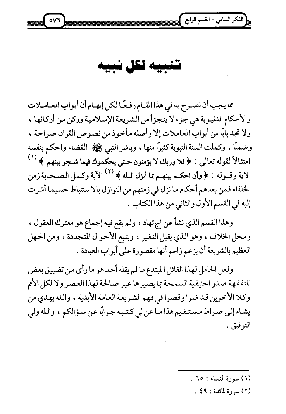 مما يجب أن نصرح به في هذا المقام رفعا لكل إبهام أن أبواب المعاملات والأحكام الدنيوية هي جزء لا يتجزأ من الشريعة الإسلامية وركن من أركانها، ولا تجد بابا من أبواب المعاملات إلا وأصله مأخوذ من نصوص القرآن صراحة، وضمنا، وكملت السنة النبوية كثيرا منها، وباشر النبي صلى الله عليه وسلم القضاء والحكم بنفسه امتثالا لقوله تعالى: {فَلا وَرَبِّكَ لا يُؤْمِنُونَ حَتَّى يُحَكِّمُوكَ فِيمَا شَجَرَ بَيْنَهُمْ} 1 الآية وقوله: {وَأَنِ احْكُمْ بَيْنَهُمْ بِمَا أَنْزَلَ اللَّهُ} 2 الآية وكمل الصحابة زمن الخلفاء فمن بعدهم أحكام ما نزل في زمنهم من النوازل بالاستناط حسبما أشرت إليه في القسم الأول والثاني من هذا الكتاب.