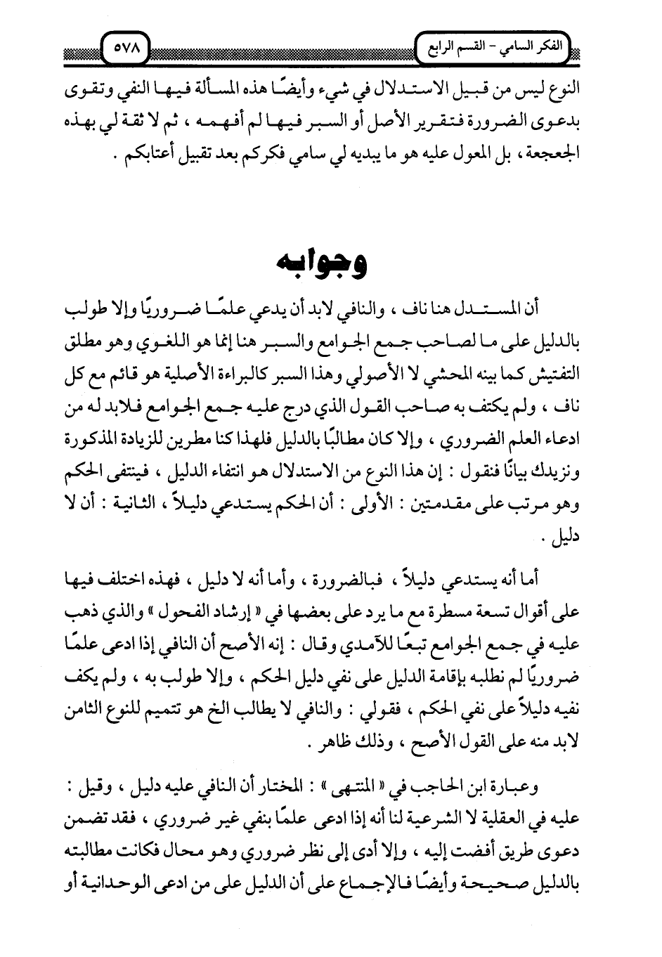 إن المستدل هنا ناف، والنافي لا بد أن يدعي علما ضروريا وإلا طولب بالدليل على ما لصاحب جمع الجوامع والسبر هنا إنما هو اللغوي وهو مطلق التفتيش كما بينه المحشي لا الأصولي وهذا السبر كالبراءة الأصلية هو قائم مع كل ناف، ولم يكتف به صاحب القول الذي درج عليه جمع الجوامع فلا بد له من ادعاء العلم الضروري، وإلا كان مطالبا بالدليل فلهذا كنا مطرين للزيادة المذكورة ونزيديك بيانا فنقول: إن هذا النوع من الاستدلال هو انتفاء الدليل، فينتفي الحكم وهو مرتب على مقدمتين: الأولى: أن الحكم يستدعي دليلا، الثانية: أن لا دليل.