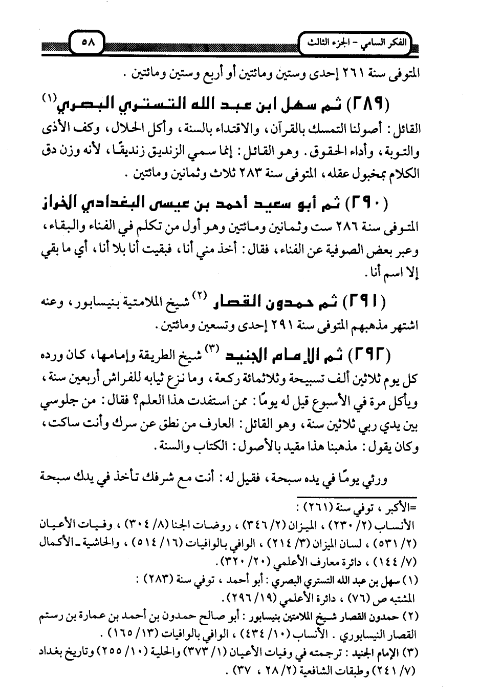 3 الإمام الجنيد: ترجمته في وفيات الأعيان "1/ 373" والحلية "10/ 255" وتاريخ بغداد "7/ 241" وطبقات الشافعية "2/ 28، 37".