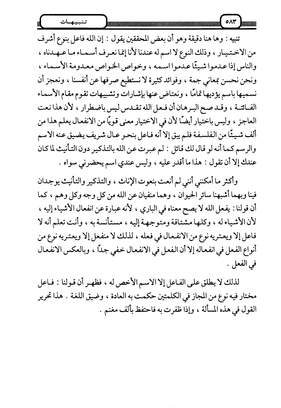تنبيه: وها هنا دقيقة وهو أن بعض المحققين يقول: إن الله فاعل بنوع أشرف من الاختيار، وذلك النوع لا اسم له عندنا لأنا إنما نعرف أسماء ما عهدناه، والناس إذا عدموا شيئا عدموا اسمه، وخواص الخواص معدومة الأسماء، ونحن نحسن بمعانٍ جمة، وفوائد كثيرة لا نستطيع صرفها عن أنفسنا، ونعجز أن نسميها باسم يؤديها تماما، ونعتاض عنها بإرشارات وتشبيهات تقوم مقام الأسماء الفائتة، وقد صح البرهان أن فعل الله تقدس ليس باضطرار؛ لأن هذا نعت العاجز، وليس باختيار أيضا لأن في الاختيار معنى قويا من الانفعال يعلم هذا من ألف شيئا من الفلسفة فلم يبق إلا أنه فاعل بنحو عال شريف يضيق عنه الاسم والرسم كما أنه لو قال لك قائل: لم عبرت عن الله بالتذكير دون التأنيث لما كان عندك إلا أن تقول: هذا ما أقدر عليه، وليس عندي اسم يحضرني سواه.
