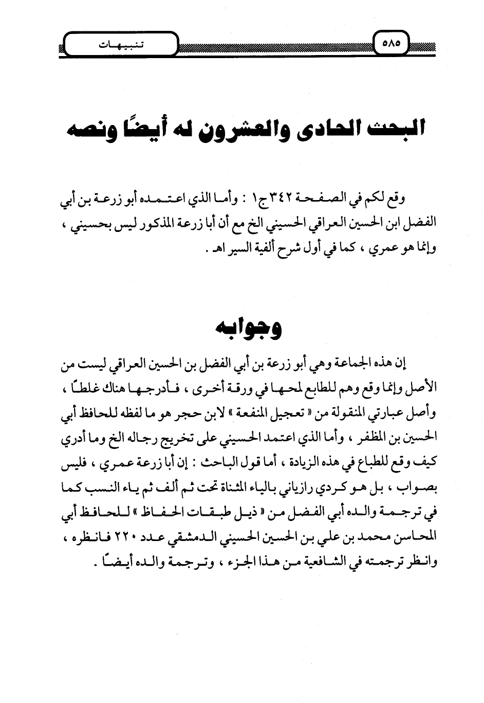 إن هذه الجماعة وهي أبو زرعة بن أبي الفضل بن الحسين العراقي ليست من الأصل وإنما وقع وهم للطابع لمحها في ورقة أخرى، فأدرجها هناك غلطا، وأصل عبارتي المنقولة من "تعجيل المنفعة" لابن حجر هو ما لفظه للحافظ أبي الحسين بن المظفر، وأما الذي اعتمد الحسيني على تخريج رجاله إلخ وما أدري كيف وقع للطباع في هذه الزيادة، أما قول الباحث: إن أبا زرعة عمري، فليس بصواب، بل هو كردي رازياني بالياء المثناة تحت ثم ألف ثم ياء النسب كما في ترجمة والده أبي الفضل من "ذيل طبقات الحفاظ" للحافظ أبي المحاسين محمد بن علي بن الحسين الحسيني الدمشقي عدد 220 فانظره، وانظر ترجمته في الشافعية من هذا الجزء، وترجمة والده أيضا.