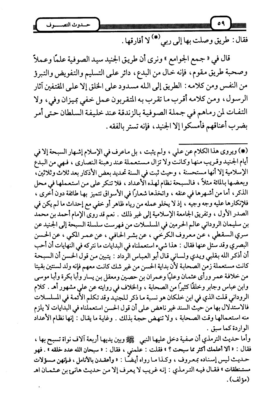 1 ويروى هذا الكلام عن علي، ولم يثبت بل ما عرف في الإسلام إشهار السبحة إلا في أيام الجنيد وقريب منها وكانت ولا تزال مستعملة عند رهبنة النصارى، فهي من البدع الإسلامية إلا أنها مستحسنة، وحيث ثبت في السنة تحديد بعض الأذكار بعد ثلاث وثلاثين، وبعضها بالمائة مثلا، فالسبحة نظام لهذه الأعداد، فلا تنكر على من استعملها في محل الذكر، أما من أشهره في عنقه، واتخذها شعارا في الأسواق تتميز بها طائفة دون أخرى، فلإنكارها عليه وجه وجيه؛ إذ لا يخلو عمله من رياء ظاهر أو خفي مع إحداث ما لم يكن في الصدر الأول، وتفريق الجامعة الإسلامية إلى غير ذلك. نعم قد روى الإمام أحمد بن محمد بن سليمان الروداني عالم الحرمين في المسلسلات من فهرست سلسلة السبحة إلى الجنيد عن سرى السقطي، عن معرو فالكرخي، عن بشر الحافي، عن عمر المكي، عن الحسن البصري وقد سئل عنها فقال: هذا شيء استعملناه في البدايات ما نتركه في النهايات أن أحب أن أذكر الله بقلبي ويدي ولساني قال أبو العباس الرداد: يتبين من قول الحسن أن السبحة كانت مستعملة زمن الصحابة لأن بداية الحسن من غير شك كانت معهم فإنه ولد لسنتين بقيتا من خلافة عمر ورأى عثمان وعليا وعمران بن حصين ومعقل بن يسار وأبا بكرة وأبا موسى وابن عباس وجابر وخلقا كثيرا من الصحابة، والخلاف في روايته عن علي مشهور. ا. هـ. كلام الروداني قلت الذي في ابن خلكان هو نسبة ما ذكر للجنيد وقد تكلم الأئمة في المسلسلات فالاستدلال بها من حيث السند غير ناهض على أن قول الحسن استعملناه في البدايات لا يلزم منه استعمالها وقت الصحابة، ولا تنهض حجة بذلك. وغاية ما يقال: إنها نظام الأعداد الواردة كما سبق.