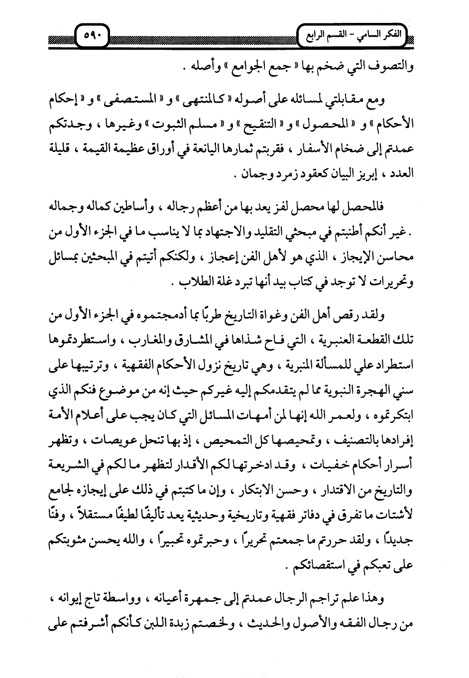 ولقد رقص أهل الفن وغواة التاريخ طربا بما أدمجتموه في الجزء الأول من تلك القطعة العنبرية، التي فاح شذاها في المشارق والمغارب، واستطردتموها استطراد علي للمسألة المنبرية، وهي تاريخ نزول الأحكام الفقهية، وترتيبها على سني الهجرة النبوية مما لم يتقدمكم إليه غيركم حيث إنه من موضوع فنكم الذي ابتكرتموه، ولعمر الله إنها لمن أمهات المسائل التي كان يجب على أعلام الأمة إفرادها بالتصنيف، وتمحيصها كل التمحيص؛ إذ بها تنحل عويصات، وتظهر أسرار أحكام خفيات، وقد ادخرتها لكم الأقدار لتظهر ما لكم في الشريعة والتاريخ من الاقتدار، وحسن الابتكار، وإن ما كتبتم في ذلك على إيجازه لجامع لأشتات ما تفرق في دفاتر فقهية وتاريخية وحديثية يعد تأليفا لطيفا مستقلا، وفنا جديدا، ولقد حررتم ما جمعتم تحريرا، وحبرتموه تحبيرا، والله يحسن مثوبتكم على تعبكم في استقصائكم.