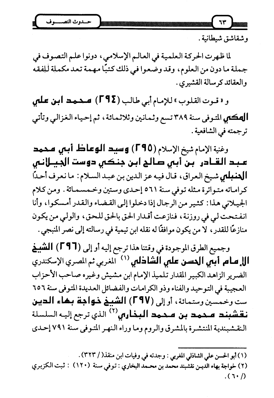 وجميع الطرق الموجودة في وقتنا هذا ترجع إليه أو إلى 296- الشيخ الإمام أبي الحسن علي الشاذلي1: المغربي ثم المصري الإسكندري الضرير الزاهد الكبير المقدار تلميذ الإمام ابن مشيش وغيره صاحب الأحزاب العجيبة في التوحيد والفناء وذو الكرامات والفضائل العديدة المتوفى سنة 656 ست وخمسين وستمائة، أو إلى 297- الشيخ خواجه بهاء الدين نقشبند محمد بن محمد البخاري2: الذي ترجع إليه السلسلة النقشبندية المنتشرة بالمشرق والروم وما وراء النهر المتوفى سنة 791 إحدى
