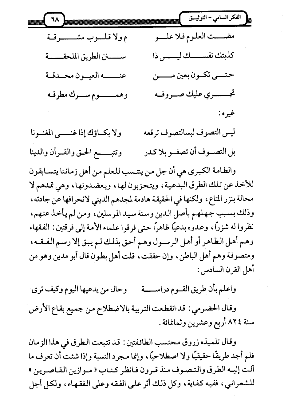 والطامة الكبرى هي أن جل من ينتسب للعلم من أهل زماننا يتسابقون للأخذ عن تلك الطرق البدعية، ويتحزبون لها، ويعضدونها، وهي تمدهم لا مجالة بنزر المتاع، ولكنها في الحقيقة هادمة لمجدهم الديني لانحرافها عن جادته، وذلك بسبب جهلهم بأصل الدين وسنة سيد المرسلين، ومن لم يأخذ عنهم، نظروا له شزرا، وعدوه بدعيا ظاهرا حتى فرقوا علماء الأمة إلى فرقتين: الفقهاء وهم أهل الظاهر أو أهل الرسول وهم أحق بذلك لم يبق إلا رسم الفقه، ومتصوفة وهم أهل الباطن، وإن حققت، قلت أهل بطون قال أبو مدين وهو من أهل القرن السادس: