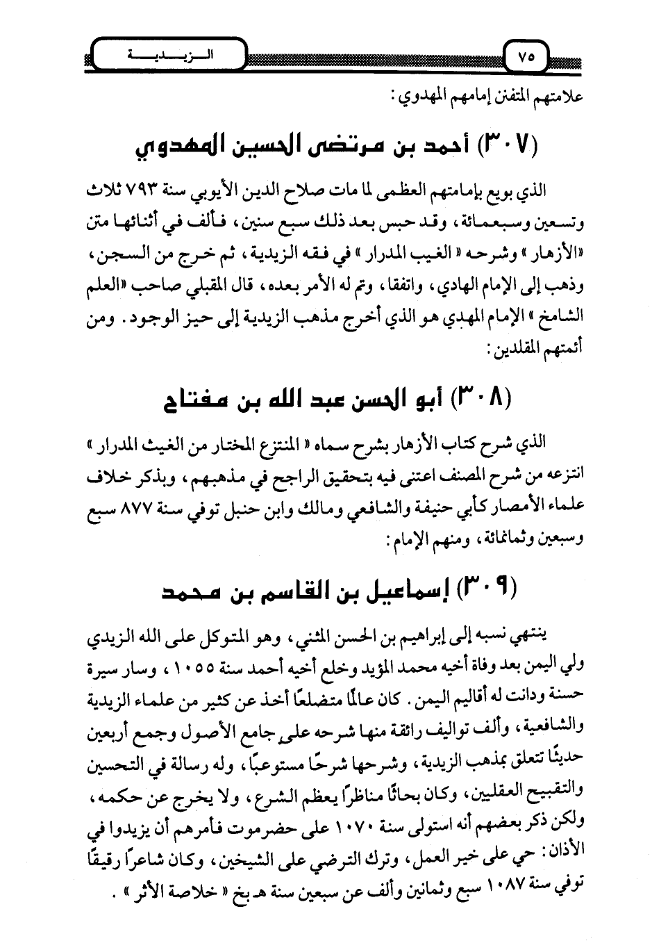 الذي بويع بإمامتهم العظمى لما مات صلاح الدين الأيوبي سنة 793 ثلاث وتسعين وسبعمائة، وقد حبس بعد ذلك سبع سنين، فألف في أثنائها متن "الأزهار" وشرحه "الغيب المدرار" في فقه الزيدية، ثم خرج من السجن، وذهب إلى الإمام الهادي، واتفقا، وتم له الأمر بعده، قال المقبلي صاحب "العلم الشامخ" الإمام المهدي هو الذي أخرج مذهب الزيدية إلى حيز الوجود. ومن أئمتهم المقلدين: