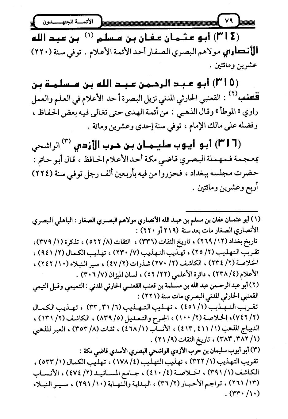 314- أبو عثمان عفان بن مسلم 1 بن عبد الله الأنصاري: مولاهم البصري الصفار أحد الأئمة الأعلام. توفي سنة "220" عشرين ومائتين.