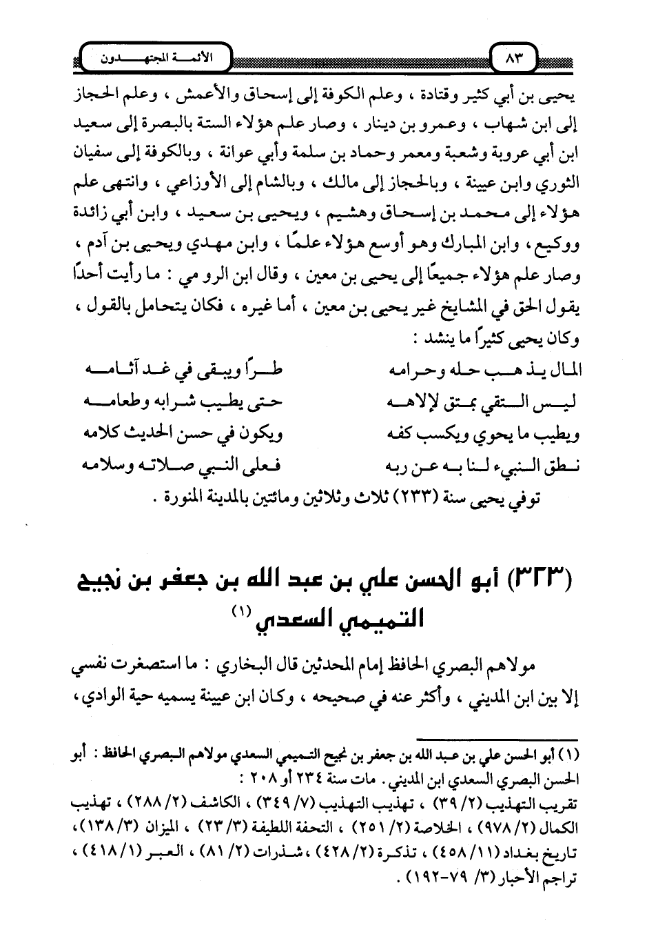 1 أبو الحسن علي بن عبد الله بن جعفر بن نجيح التميمي السعدي مولاهم البصري الحافظ: أبو الحسن البصري السعدي ابن المديني. مات سنة 234 أو 208: