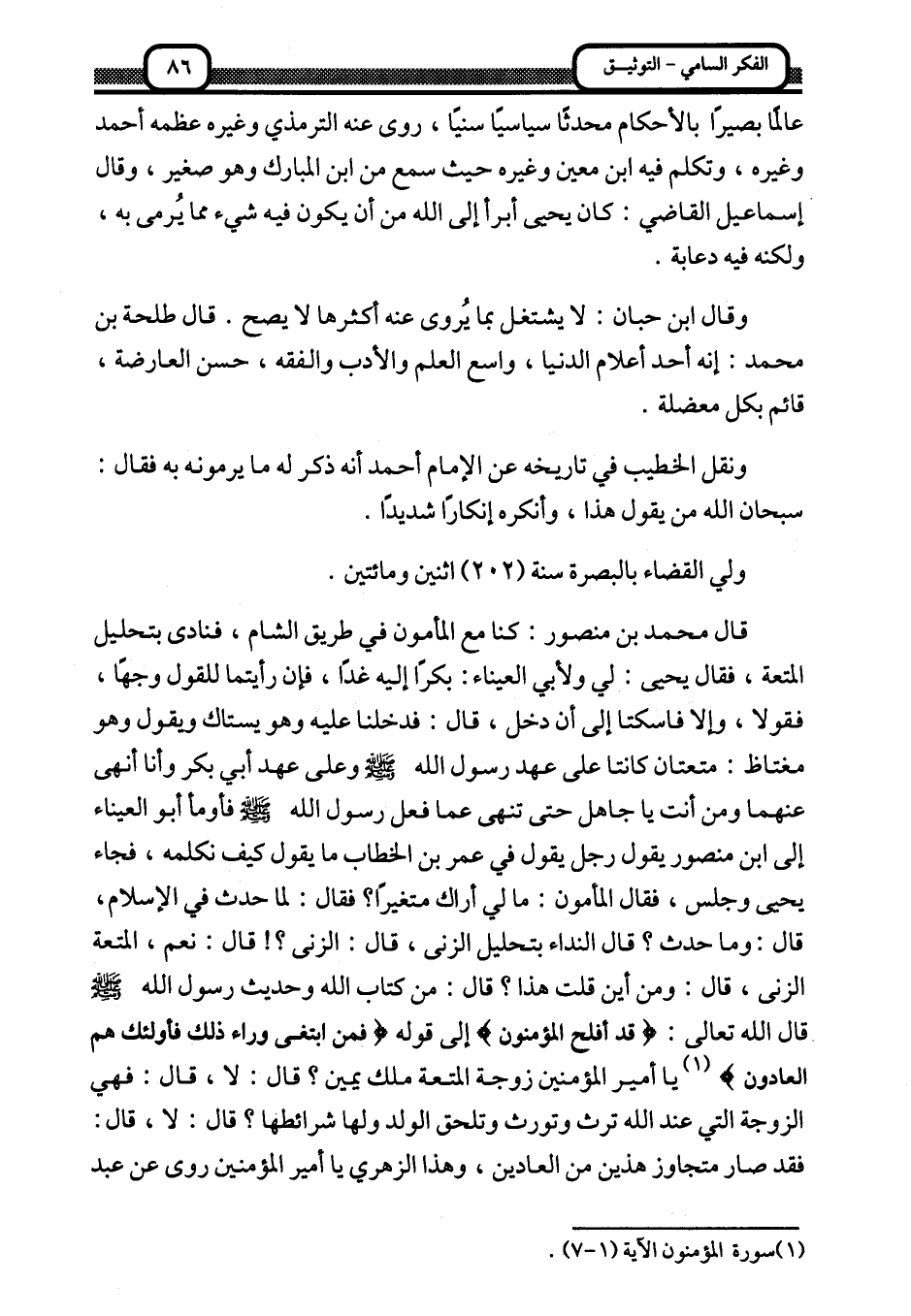 قال محمد بن منصور: كنا مع المأمون في طريق الشام، فنادى بتحليل المتعة، فقال يحيى: لي ولأبي العيناء: بكرا إليه غدا، فإن رأيتما للقول وجها، فقولا، وإلا فاسكتا إلى أن دخل، قال: فدخلنا عليه وهو يستاك ويقول وهو مغتاظ: متعتان كانتا على عهد رسول الله -صلى الله عليه وسلم- وعلى عهد أبي بكر وأنا أنهى عنهما ومن أنت يا جاهل حتى تنهى عما فعل رسول الله -صلى الله عليه وسلم- فأومأ أبو العيناء إلى ابن منصور يقول رجل يقول في عمر بن الخطاب ما يقول كيف نكلمه، فجاء يحيى وجلس، فقال المأمون: ما لي أراك متغيرا؟ فقال: لما حدث في الإسلام، قال: وما حدث؟ قال النداء بتحليل الزنى، قال: الزنى؟! قال: نعم، المتعة الزنى، قال: ومن أين قلت هذا؟ قال: من كتاب الله وحديث رسول الله -صلى الله عليه وسلم- قال الله تعالى: {قَدْ أَفْلَحَ الْمُؤْمِنُونَ} إلى قوله: {فَمَنِ ابْتَغَى وَرَاءَ ذَلِكَ فَأُولَئِكَ هُمُ الْعَادُونَ} 1 يا أمير المؤمنين زوجة المتعة ملك يمين؟ قال: لا، قال: فهي الزوجة التي عند الله ترث وتورث وتلحق الولد ولها شرائطها؟ قال: لا، قال: فقد صار متجاوز هذين من العادين، وهذا الزهري يا أمير المؤمنين روى عن عبد