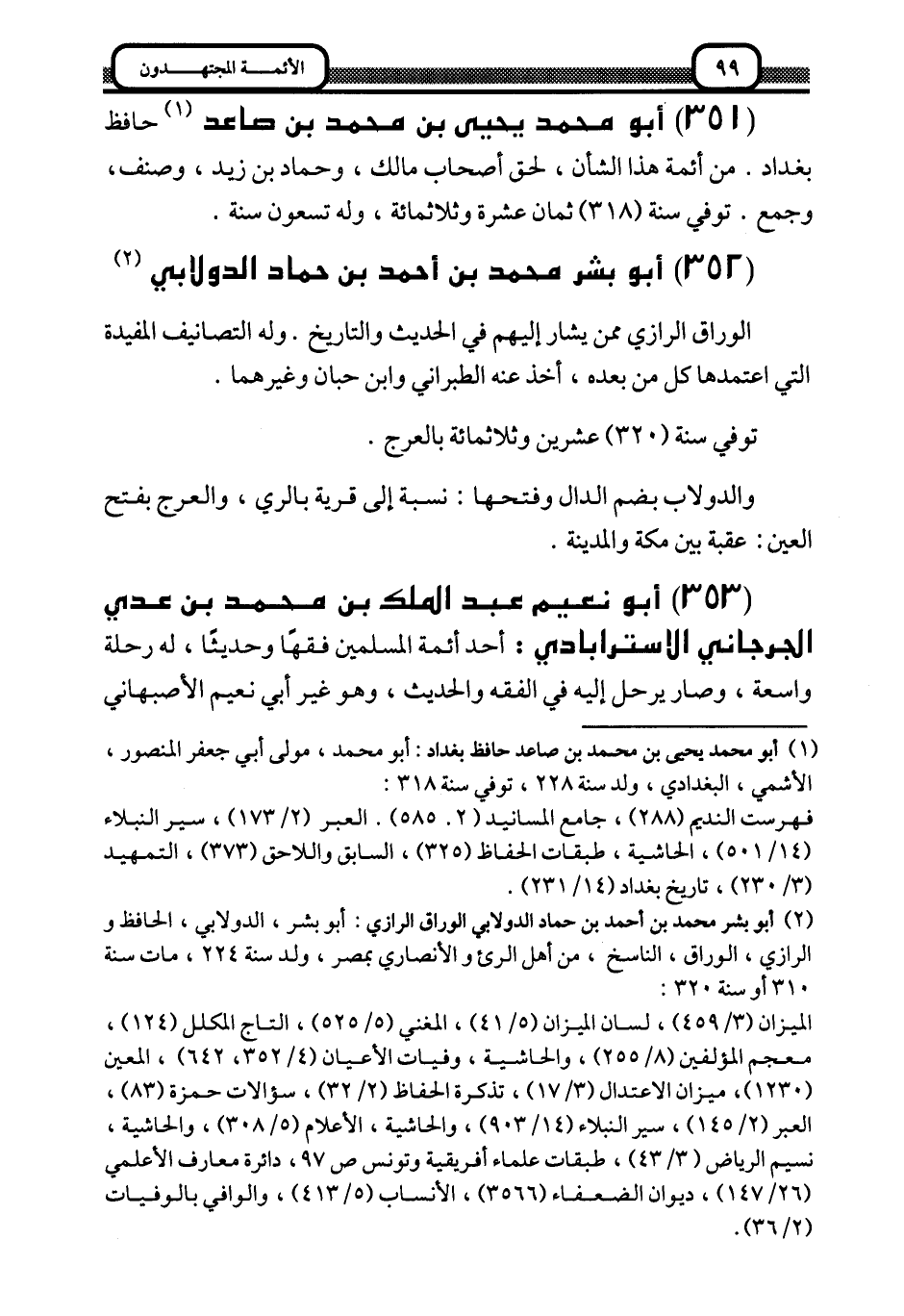 353- أبو نعيم عبد الملك بن محمد بن عدي الجرجاني الإسترابادي: أحد أئمة المسلمين فقها وحديثا، له رحلة واسعة، وصار يرحل إليه في الفقه والحديث، وهو غير أبي نعيم الأصبهاني