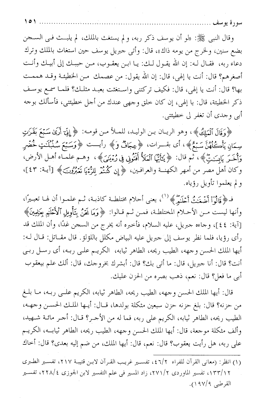 ) وقال الملك ( ، وهو الريان بن الوليد ، للملأ من قومه : ( إني أرى سبع بقرات سمان يأكلهن سبع ( ، أي بقرات ، ) عجاف و ( رأيت ) وسبع سنبلات خضر وأخر يابسات ( ، ثم قال : ( يَأيُها المَلأ أفتوني في رُءياي ( ، وهم علماء أهل الأرض ،