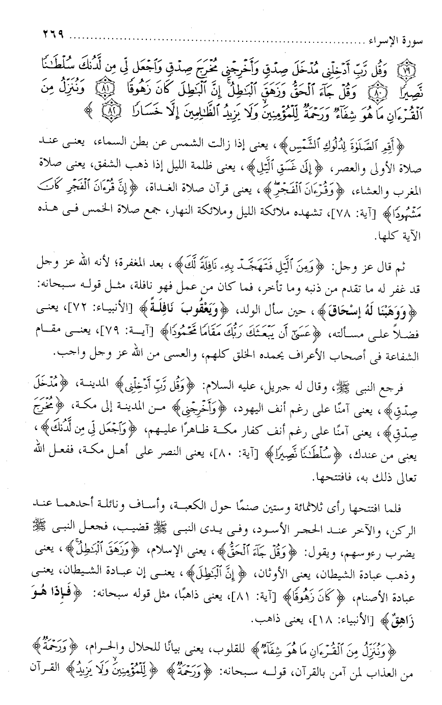 فرجع النبي ( صلى الله عليه وسلم ) ، وقال له جبريل ، عليه السلام : ( وقل رب أدخلني ( المدينة ، ) مدخل صدق ( ، يعنى آمناً على رغم أنف اليهود ، ) وأخرجني ( من المدينة إلى مكة ، ) مخرج صدق ( ، يعنى آمنا على رغم أنف كفار مكة ظاهراً عليهم ، ) واجعل لي من لدنك ( ،