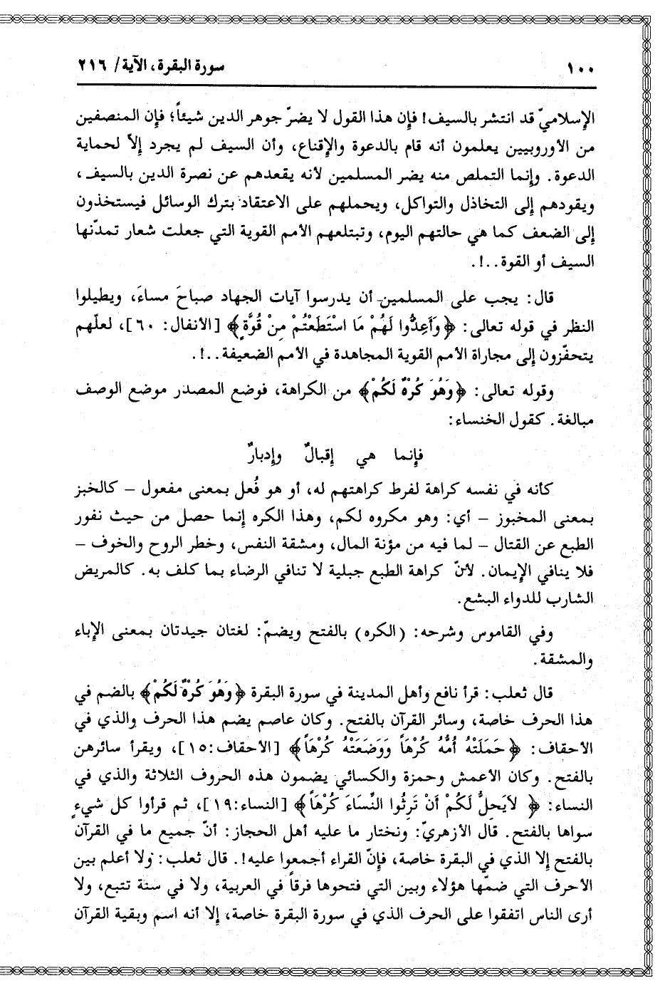 وقوله تعالى: وَهُوَ كُرْهٌ لَكُمْ من الكراهة، فوضع المصدر موضع الوصف مبالغة. كقول الخنساء: