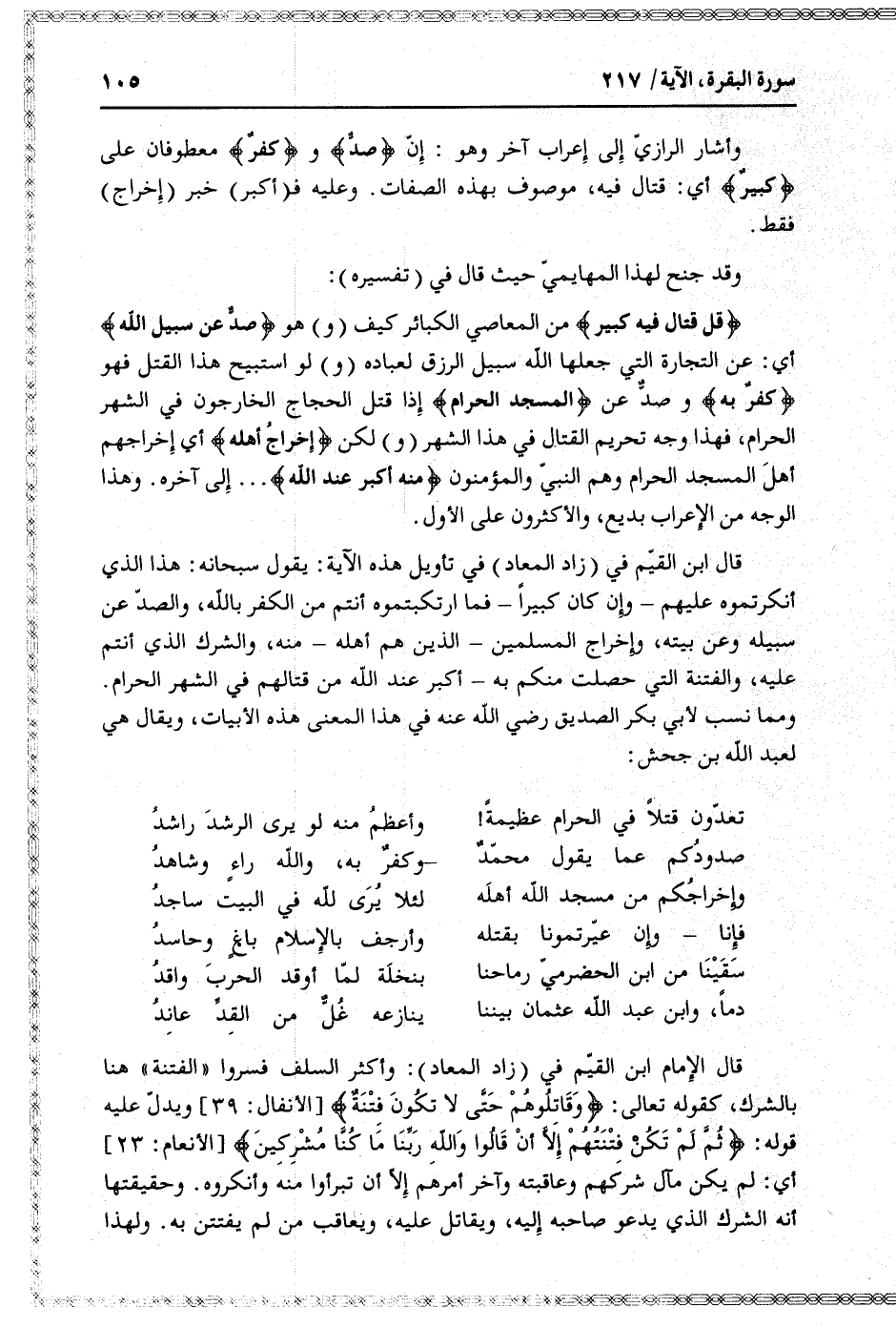 قال ابن القيّم في (زاد المعاد) في تأويل هذه الآية: يقول سبحانه: هذا الذي أنكرتموه عليهم- وإن كان كبيرا- فما ارتكبتموه أنتم من الكفر بالله، والصدّ عن سبيله وعن بيته، وإخراج المسلمين- الذين هم أهله- منه، والشرك الذي أنتم عليه، والفتنة التي حصلت منكم به- أكبر عند الله من قتالهم في الشهر الحرام.