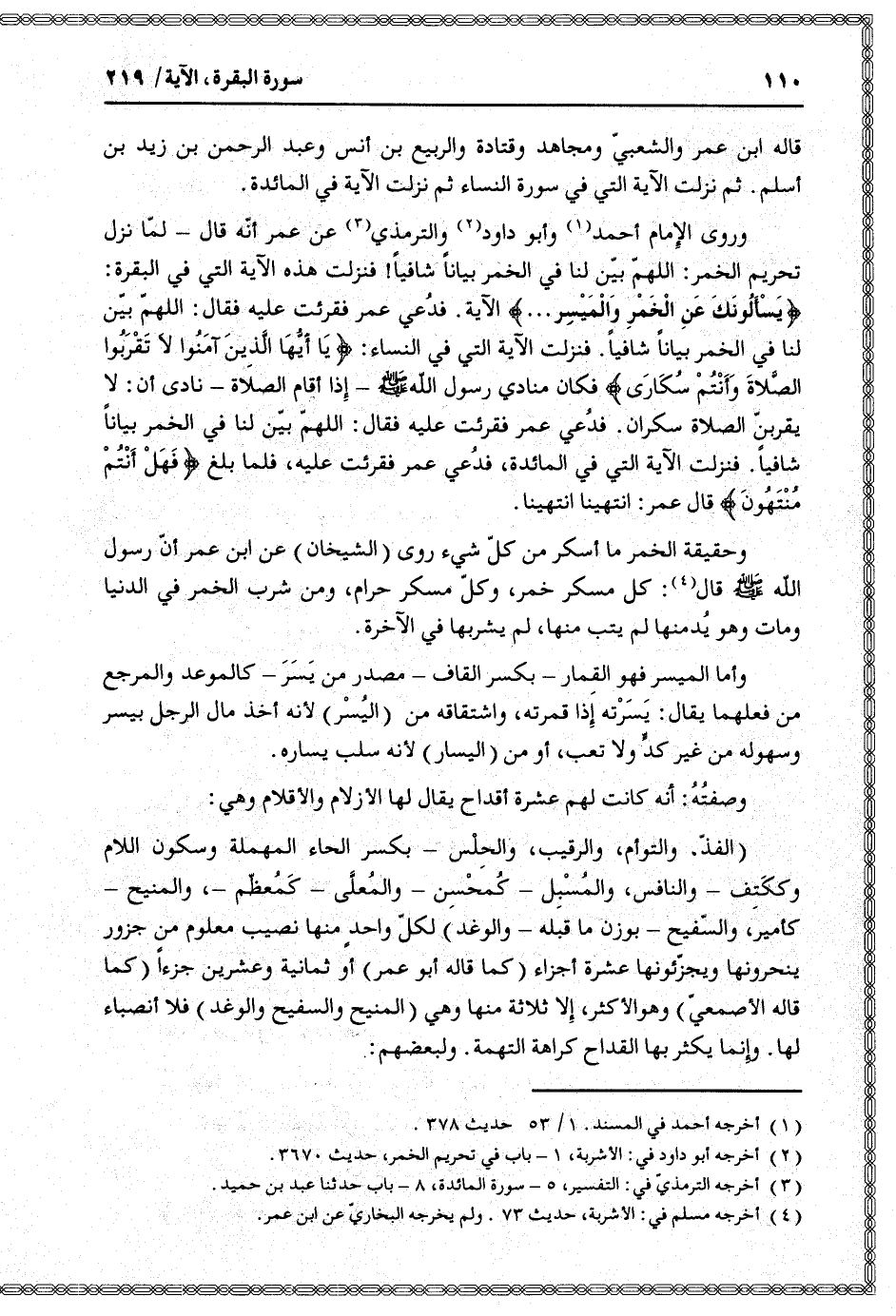 وروى الإمام أحمد «1» وأبو داود «2» والترمذي «3» عن عمر أنّه قال- لمّا نزل تحريم الخمر: اللهمّ بيّن لنا في الخمر بيانا شافيا! فنزلت هذه الآية التي في البقرة: