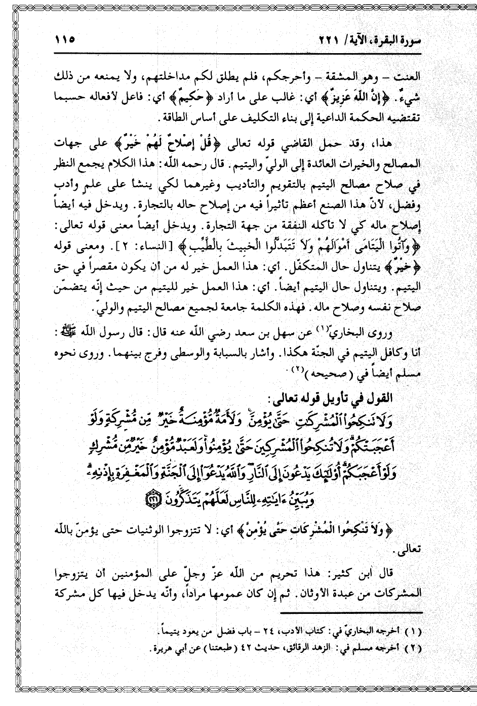 وَلا تَنْكِحُوا الْمُشْرِكاتِ حَتَّى يُؤْمِنَّ وَلَأَمَةٌ مُؤْمِنَةٌ خَيْرٌ مِنْ مُشْرِكَةٍ وَلَوْ أَعْجَبَتْكُمْ وَلا تُنْكِحُوا الْمُشْرِكِينَ حَتَّى يُؤْمِنُوا وَلَعَبْدٌ مُؤْمِنٌ خَيْرٌ مِنْ مُشْرِكٍ وَلَوْ أَعْجَبَكُمْ أُولئِكَ يَدْعُونَ إِلَى النَّارِ وَاللَّهُ يَدْعُوا إِلَى الْجَنَّةِ وَالْمَغْفِرَةِ بِإِذْنِهِ وَيُبَيِّنُ آياتِهِ لِلنَّاسِ لَعَلَّهُمْ يَتَذَكَّرُونَ (221)