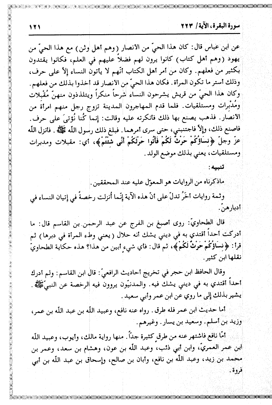 عن ابن عباس قال: كان هذا الحيّ من الأنصار (وهم أهل وثن) مع هذا الحيّ من يهود (وهم أهل كتاب) كانوا يرون لهم فضلا عليهم في العلم، فكانوا يقتدون بكثير من فعلهم. وكان من أمر أهل الكتاب أنّهم لا يأتون النساء إلّا على حرف، وذلك أستر ما تكون المرأة. فكان هذا الحيّ من الأنصار قد أخذوا بذلك من فعلهم.