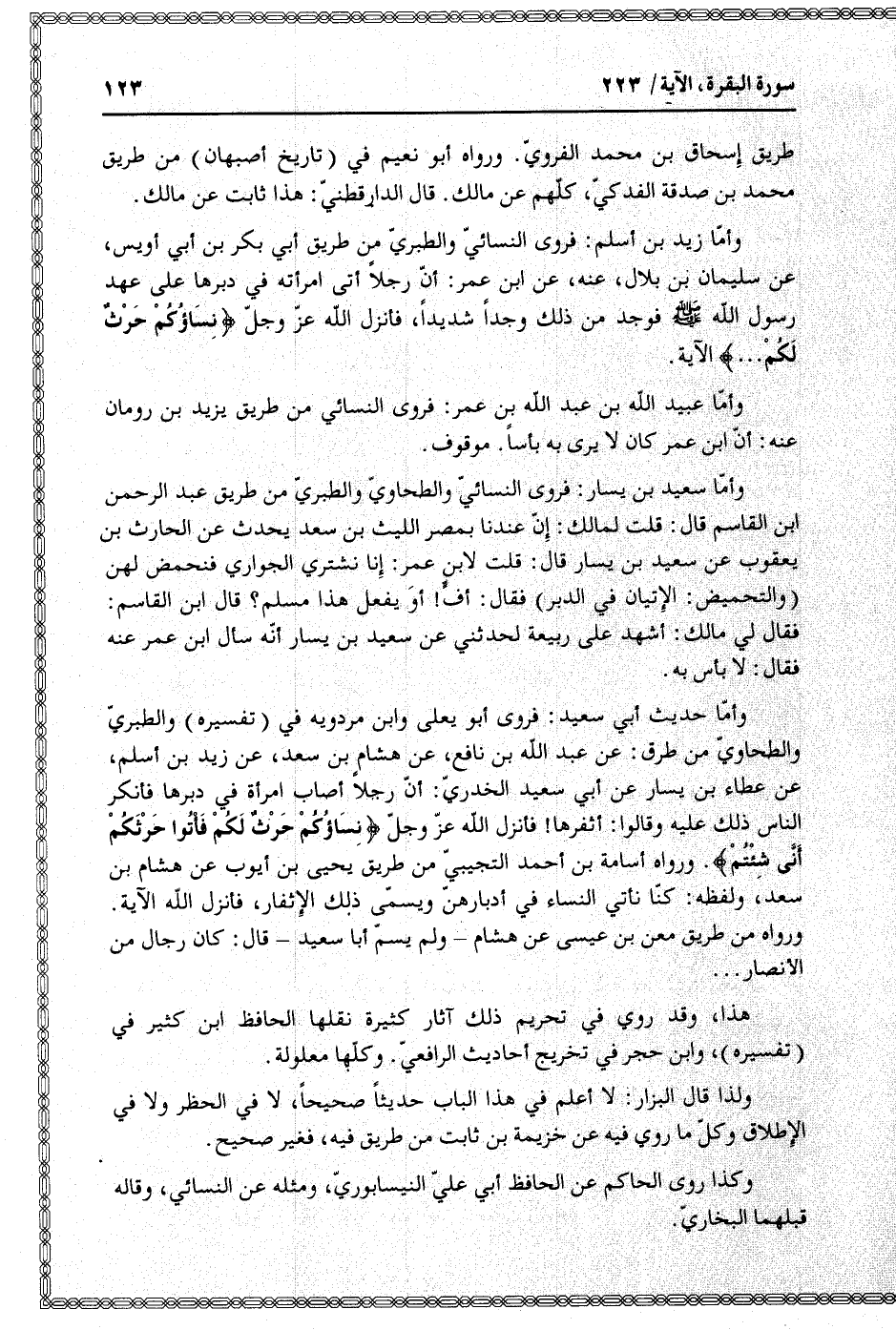 وأمّا حديث أبي سعيد: فروى أبو يعلى وابن مردويه في (تفسيره) والطبريّ والطحاويّ من طرق: عن عبد الله بن نافع، عن هشام بن سعد، عن زيد بن أسلم، عن عطاء بن يسار عن أبي سعيد الخدريّ: أنّ رجلا أصاب امرأة في دبرها فأنكر الناس ذلك عليه وقالوا: أثفرها! فأنزل الله عزّ وجلّ نِساؤُكُمْ حَرْثٌ لَكُمْ فَأْتُوا حَرْثَكُمْ أَنَّى شِئْتُمْ. ورواه أسامة بن أحمد التجيبي من طريق يحيى بن أيوب عن هشام بن سعد، ولفظه: كنّا نأتي النساء في أدبارهنّ ويسمّى ذلك الإثفار، فأنزل الله الآية.