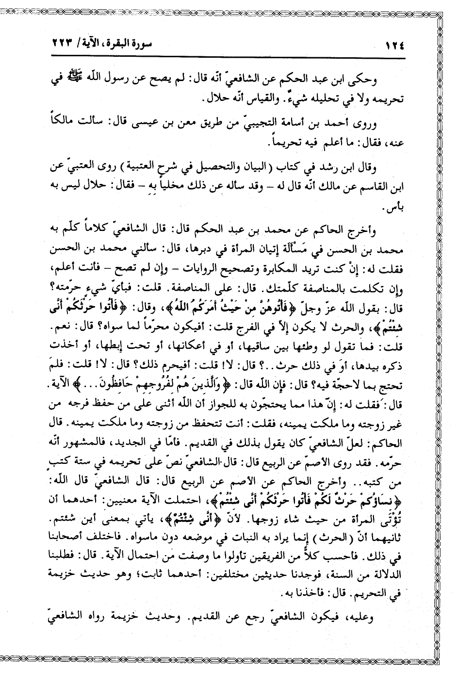 وأخرج الحاكم عن محمد بن عبد الحكم قال: قال الشافعيّ كلاما كلّم به محمد بن الحسن في مسألة إتيان المرأة في دبرها، قال: سألني محمد بن الحسن فقلت له: إن كنت تريد المكابرة وتصحيح الروايات- وإن لم تصح- فأنت أعلم، وإن تكلمت بالمناصفة كلّمتك. قال: على المناصفة. قلت: فبأيّ شيء حرّمته؟