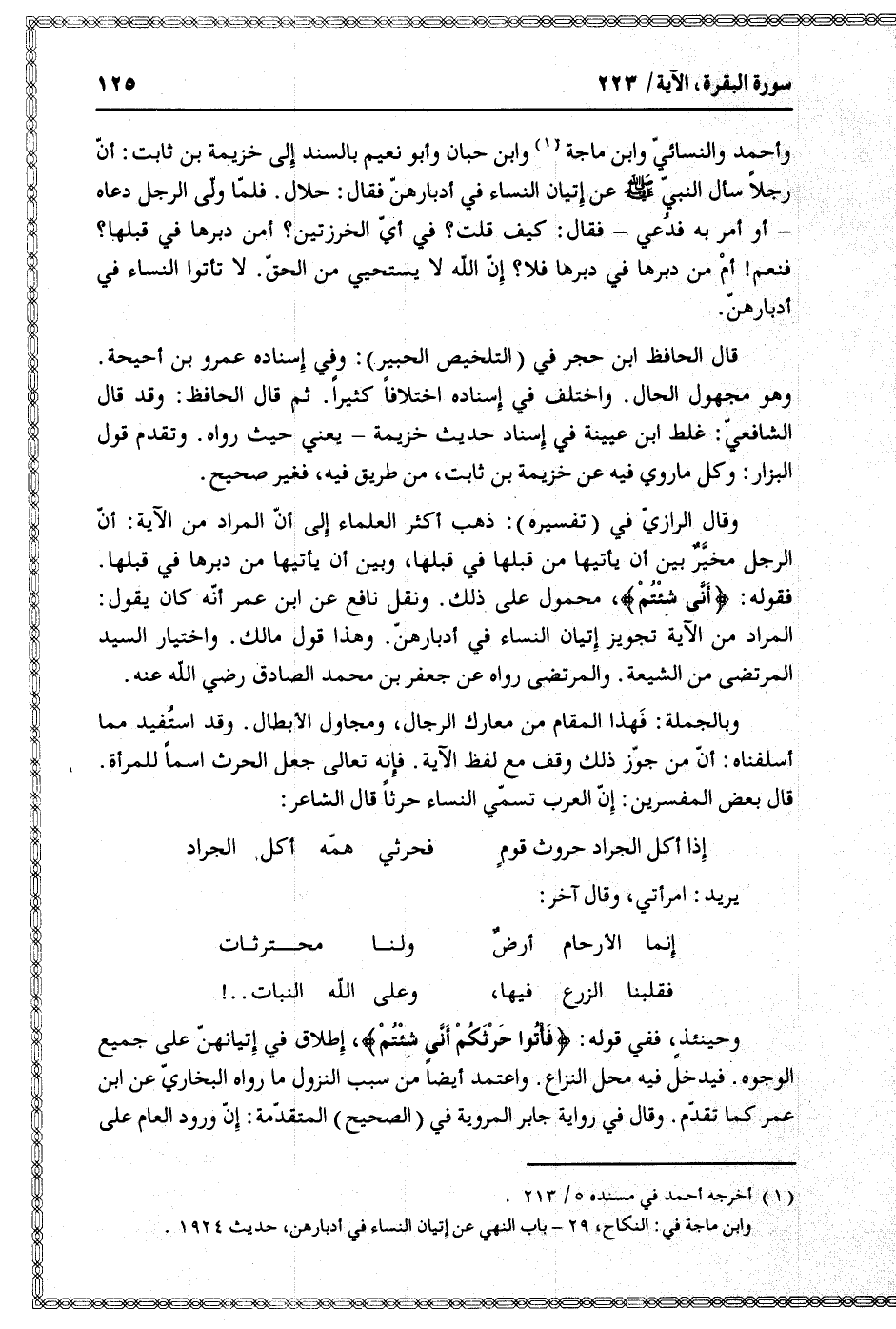 وأحمد والنسائيّ وابن ماجة «1» وابن حبان وأبو نعيم بالسند إلى خزيمة بن ثابت: أنّ رجلا سأل النبيّ صلّى الله عليه وسلم عن إتيان النساء في أدبارهنّ فقال: حلال.