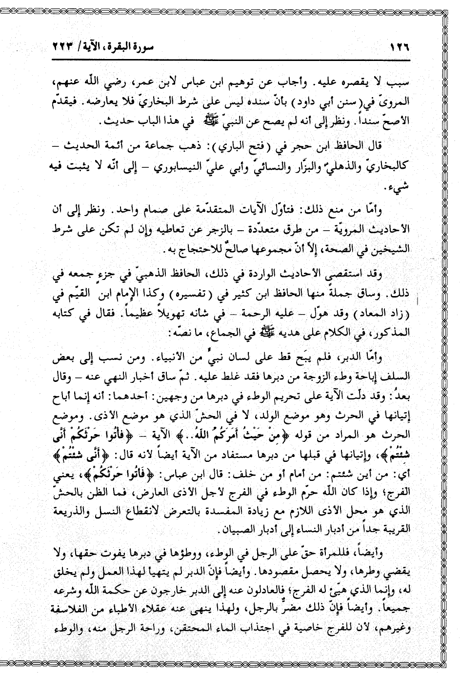 وأمّا الدبر، فلم يبح قط على لسان نبيّ من الأنبياء. ومن نسب إلى بعض السلف إباحة وطء الزوجة من دبرها فقد غلط عليه. ثمّ ساق أخبار النهي عنه- وقال بعد: وقد دلّت الآية على تحريم الوطء في دبرها من وجهين: أحدهما: أنه إنما أباح إتيانها في الحرث وهو موضع الولد، لا في الحشّ الذي هو موضع الأذى. وموضع الحرث هو المراد من قوله مِنْ حَيْثُ أَمَرَكُمُ اللَّهُ ... الآية- فَأْتُوا حَرْثَكُمْ أَنَّى شِئْتُمْ، وإتيانها في قبلها من دبرها مستفاد من الآية أيضا لأنه قال: أَنَّى شِئْتُمْ أي: من أين شئتم: من أمام أو من خلف: قال ابن عباس: فَأْتُوا حَرْثَكُمْ، يعني الفرج وإذا كان الله حرّم الوطء في الفرج لأجل الأذى العارض، فما الظن بالحشّ الذي هو محل الأذى اللازم مع زيادة المفسدة بالتعرض لانقطاع النسل والذريعة القريبة جدا من أدبار النساء إلى أدبار الصبيان.