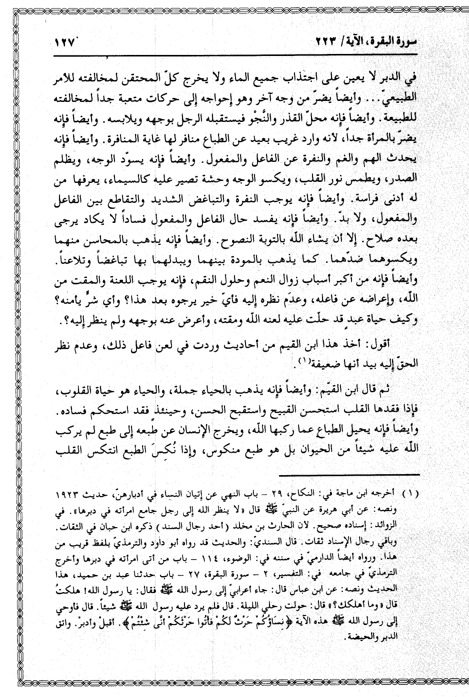في الدبر لا يعين على اجتذاب جميع الماء ولا يخرج كلّ المحتقن لمخالفته للأمر الطبيعيّ ... وأيضا يضرّ من وجه آخر وهو إحواجه إلى حركات متعبة جدا لمخالفته للطبيعة. وأيضا فإنه محلّ القذر والنّجو فيستقبله الرجل بوجهه ويلابسه. وأيضا فإنه يضرّ بالمرأة جدا، لأنه وارد غريب بعيد عن الطباع منافر لها غاية المنافرة. وأيضا فإنه يحدث الهم والغم والنفرة عن الفاعل والمفعول. وأيضا فإنه يسوّد الوجه، ويظلم الصدر، ويطمس نور القلب، ويكسو الوجه وحشة تصير عليه كالسيماء، يعرفها من له أدنى فراسة. وأيضا فإنه يوجب النفرة والتباغض الشديد والتقاطع بين الفاعل والمفعول، ولا بدّ. وأيضا فإنه يفسد حال الفاعل والمفعول فسادا لا يكاد يرجى بعده صلاح. إلا أن يشاء الله بالتوبة النصوح. وأيضا فإنه يذهب بالمحاسن منهما ويكسوهما ضدّهما. كما يذهب بالمودة بينهما ويبدلهما بها تباغضا وتلاعنا.