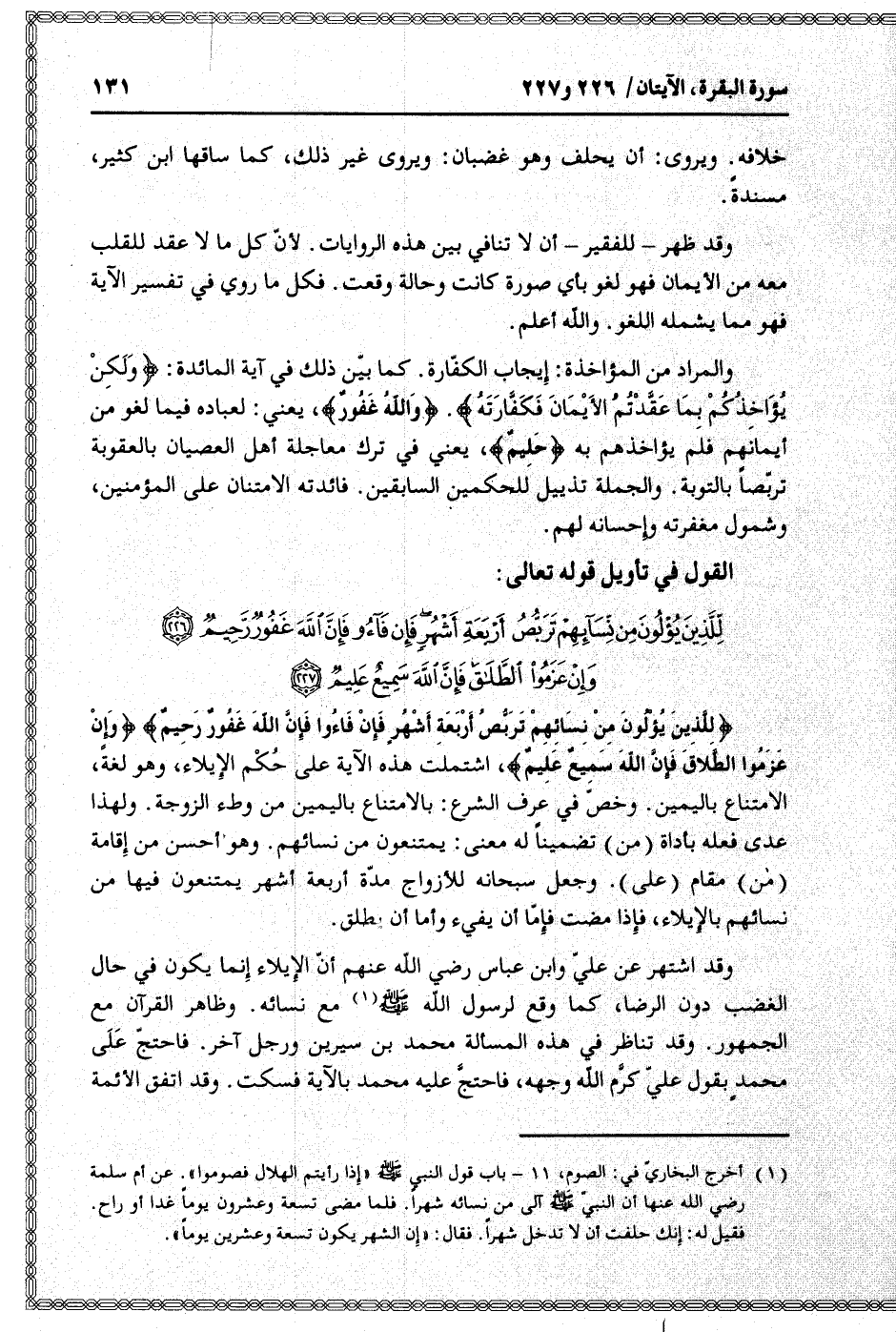 لِلَّذِينَ يُؤْلُونَ مِنْ نِسائِهِمْ تَرَبُّصُ أَرْبَعَةِ أَشْهُرٍ فَإِنْ فاؤُ فَإِنَّ اللَّهَ غَفُورٌ رَحِيمٌ (226) وَإِنْ عَزَمُوا الطَّلاقَ فَإِنَّ اللَّهَ سَمِيعٌ عَلِيمٌ (227)