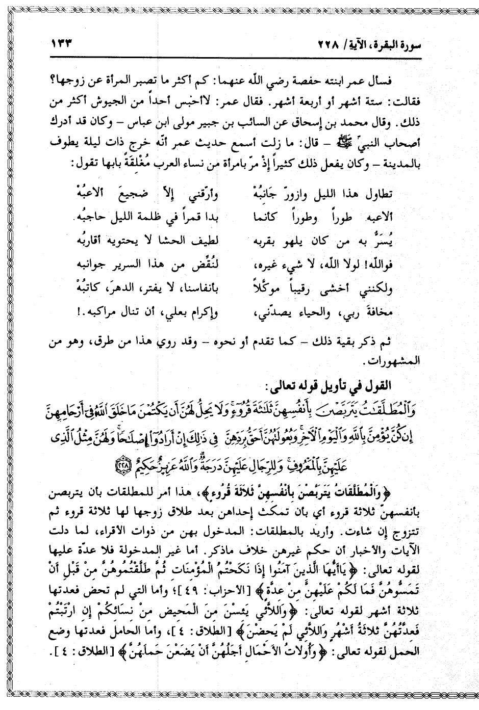 وَالْمُطَلَّقاتُ يَتَرَبَّصْنَ بِأَنْفُسِهِنَّ ثَلاثَةَ قُرُوءٍ وَلا يَحِلُّ لَهُنَّ أَنْ يَكْتُمْنَ ما خَلَقَ اللَّهُ فِي أَرْحامِهِنَّ إِنْ كُنَّ يُؤْمِنَّ بِاللَّهِ وَالْيَوْمِ الْآخِرِ وَبُعُولَتُهُنَّ أَحَقُّ بِرَدِّهِنَّ فِي ذلِكَ إِنْ أَرادُوا إِصْلاحاً وَلَهُنَّ مِثْلُ الَّذِي عَلَيْهِنَّ بِالْمَعْرُوفِ وَلِلرِّجالِ عَلَيْهِنَّ دَرَجَةٌ وَاللَّهُ عَزِيزٌ حَكِيمٌ (228)